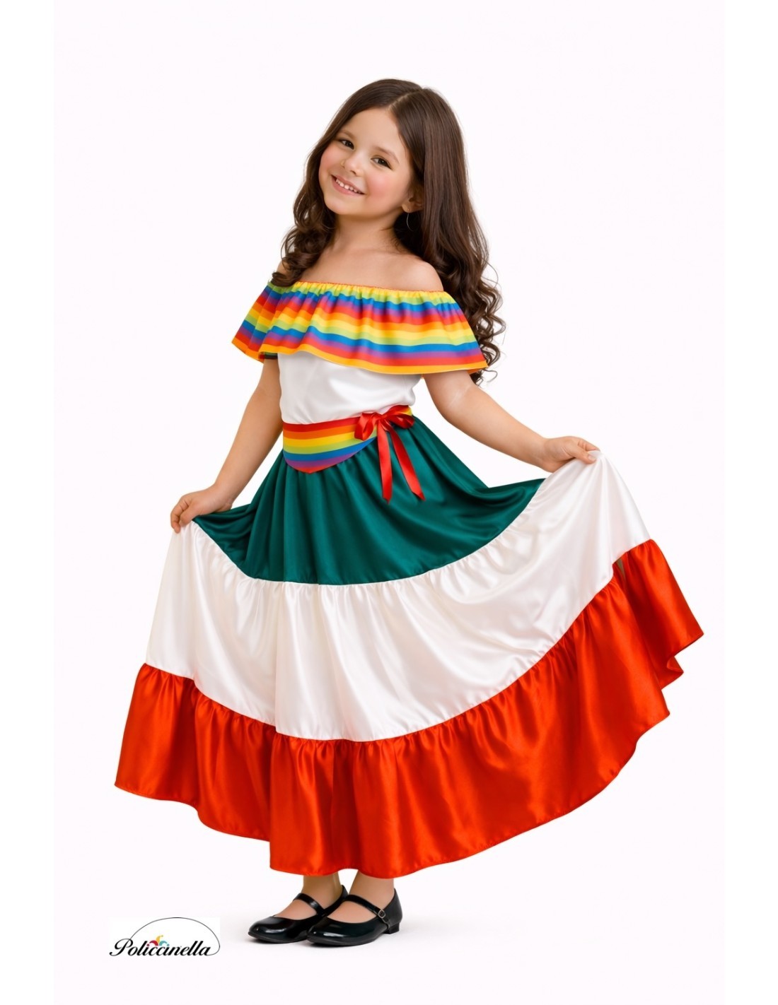 Um vestido cheio de cor e alegria, inspirado na tradição mexicana. Confeccionado em suave cetim, possui elástico na cintura para um ajuste confortável e um decote tipo barco ou bardot, também elástico, que realça a silhueta e garante sustentação. As mangas são decoradas com fita ondulada e possuem elástico para se ajustarem ao braço com elegância. O decote apresenta um colorido babado, proporcionando movimento e um ar festivo muito característico. Na cintura, um cinto multicolorido amarrável completa o conjunto, marcando a figura e reforçando o estilo tradicional. Uma fantasia linda, confortável e muito vistosa, ideal para festas temáticas, Carnaval ou representações culturais.