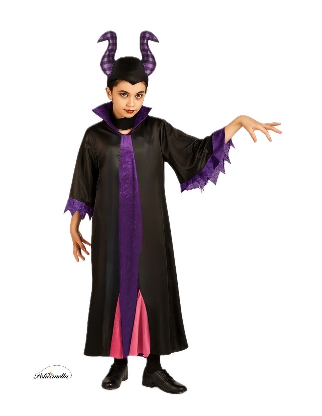 Este traje da Rainha Má apresenta um vestido longo preto feito de cetim, com mangas largas e ligeiramente acampanadas que incluem detalhes de veludo em uma base espumada. No centro, um painel roxo, do mesmo tecido das mangas, se estende do pescoço até a bainha. Em cada lado da bainha, há detalhes em rosa morango do mesmo material do painel central. O pescoço, feito de cetim espumado, para garantir sua estrutura, é fechado com velcro atrás para um ajuste confortável. Inclui um chapéu preto feito de cetim espumado, com os característicos chifres que representam o personagem, preenchidos com espuma para manter sua forma e com elástico na parte de trás para um melhor ajuste.