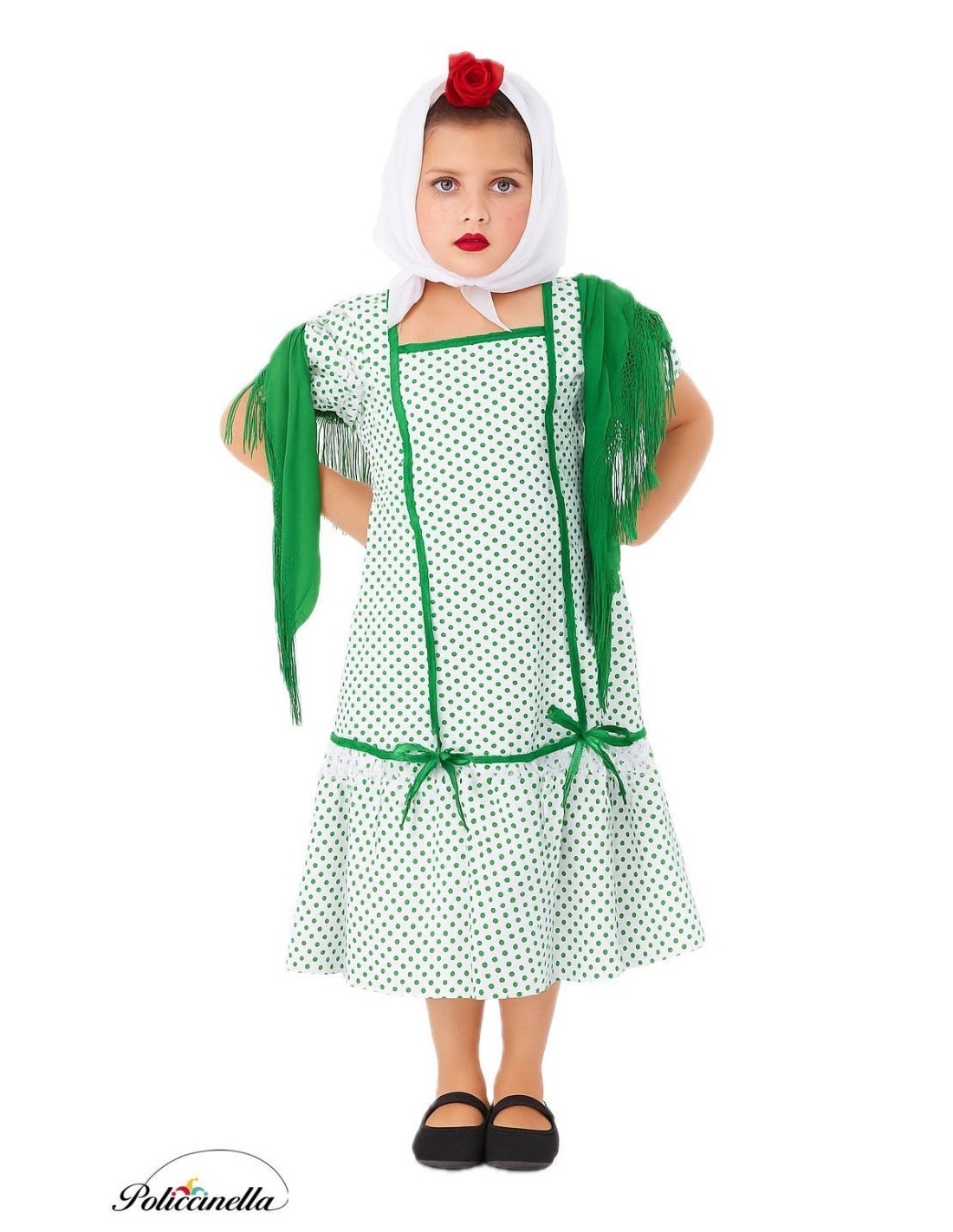 Vestido tradicional e castiço de chulapa, confeccionado em suave cetim com decote quadrado e fecho de velcro na nuca. Elásticos nas costas e laterais realçam a figura com conforto. Decorado com fitas e laços de cetim combinando com os poás e um delicado renda. As mangas possuem elástico para um ajuste perfeito. Inclui lenço para a cabeça e o clássico xale em suave ponto de máquina com franjas, para completar este encantador conjunto madrilenho.