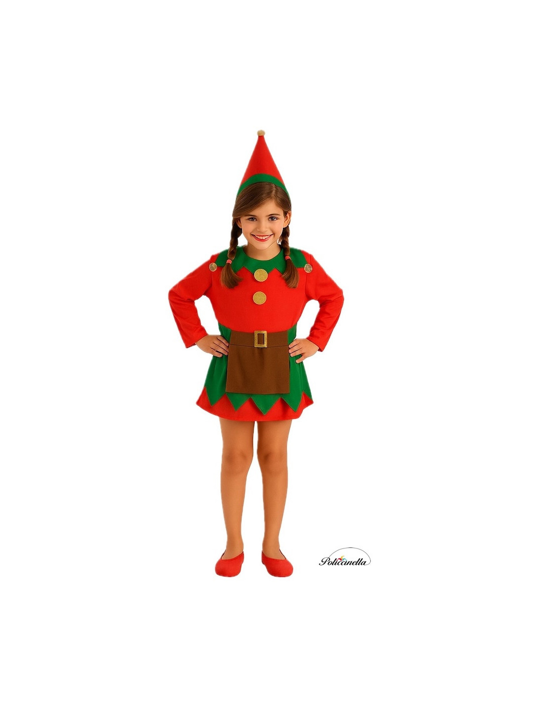 Encantador vestido em malha de máquina semielástica, suave ao toque e com cintura franzida para um ajuste favorecedor. Gola e saia em textura aveludada, decorados com apliques dourados em forma de botão que dão um toque brilhante e festivo. O avental marrom, costurado na saia, acrescenta um toque tradicional ao design. Inclui cinto de feltro com fivela dourada fosca e fecho de velcro, e um gorro cônico com acabamento aveludado e um adorno dourado na ponta. Um conjunto de alta qualidade para uma elfa inesquecível.