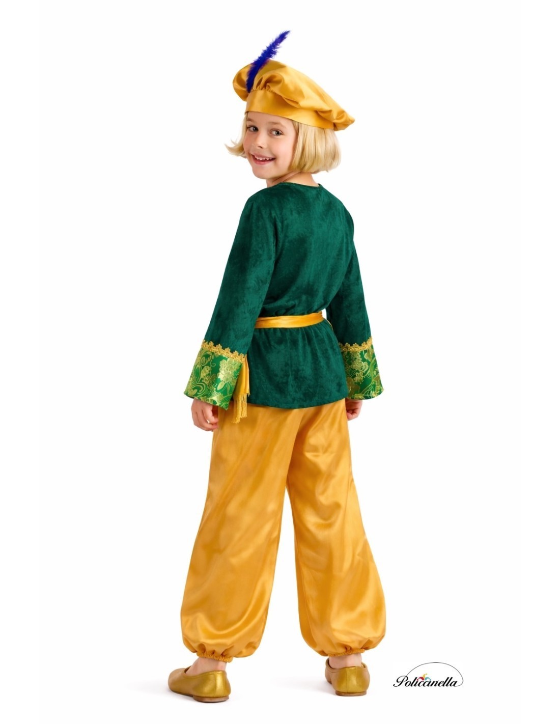 Este traje de pajem deslumbra pela sua confecção de alta qualidade e pela elegância de seus acabamentos. A jaqueta, em veludo verde de toque suave, ajusta-se ao pescoço com velcro e exibe uma frente espetacular e mangas decoradas com tecido brocado tipo damasco e galão dourado, conferindo-lhe um ar majestoso. As calças, em cetim dourado, possuem elástico na cintura e nos tornozelos para um ajuste confortável, enquanto o cinto, também em cetim, é adornado com franjas douradas que conferem distinção. O gorro bufante, em cetim combinando e coroado com uma pena, completa o conjunto. A joia do traje é, sem dúvida, o luxuoso brocado da jaqueta, que confere autenticidade e nobreza. Um traje suave, vistoso e distinto, ideal para desfiles, presépios vivos e celebrações de Natal cheias de tradição.
