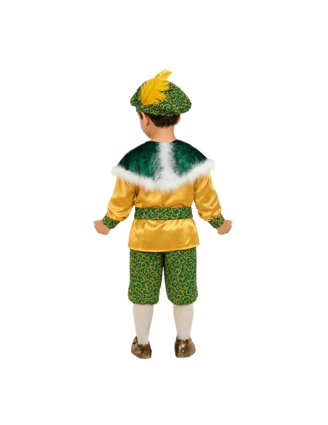 Uma fantasia cheia de cor e distinção, perfeita para desfiles e celebrações. Inclui um chapéu abullonado feito de tecido festivo tipo gaze com desenhos dourados impressos, adornado com passamanaria e uma pena amarela que lhe confere um ar principesco. A jaqueta de cetim dourado é realçada por um babador de veludo verde suave, decorado com passamanaria dourada e com uma delicada borda de plumas brancas, com fecho de velcro no pescoço. As calças bombachas, feitas do mesmo tecido festivo de gaze, possuem elástico na cintura e abaixo dos joelhos para maior conforto. O conjunto é complementado por um cinto combinando, decorado com elegantes franjas, e sapatos tipo babucha em espuma que mantêm a forma e oferecem um acabamento impecável. "O padrão do tecido pode variar ligeiramente em relação ao mostrado na fotografia, mantendo sempre a mesma qualidade e estilo."