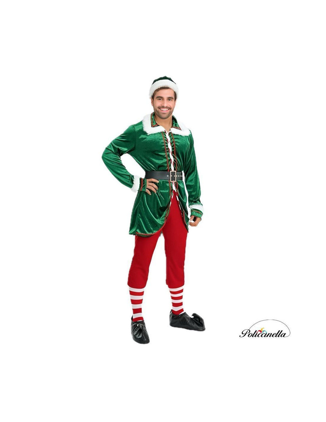 Este refinado disfarce de duende elfo de Natal destaca pela alta qualidade dos seus tecidos e pela excelência em cada acabamento. Confeccionado em veludo suave e resistente, combina conforto e elegância para ser usado em celebrações e eventos natalinos. A jaqueta, com fecho central, está decorada com um alegre design de doces e embelezada com gola e punhos de pelo branco suave, com detalhes em vermelho, proporcionando um contraste festivo e encantador. As calças, também em veludo, têm cintura elástica para um ajuste confortável, enquanto as meias de malha grossa combinam com o estilo de inverno. Inclui também chinelos e cinto de poliéster com aparência de couro, que conferem realismo e solidez ao conjunto. O traje é completado com um gorro de veludo decorado com pelo suave, tornando-o um conjunto completo, resistente e de grande presença.
