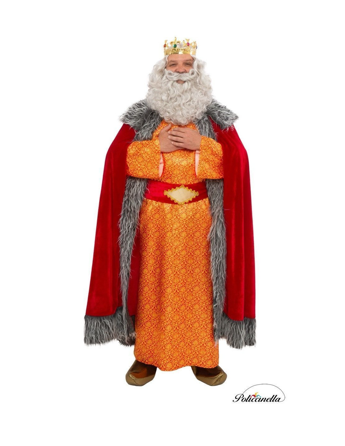 Este majestoso disfarce do Rei Melchior transmite a grandeza e solenidade de um monarca do Oriente, graças à riqueza de seus tecidos e acabamentos. A casaca longa, confeccionada em cetim vermelho com delicada estampa dourada, traz um ar régio e luminoso. Sobre ela repousa uma imponente capa de veludo, finalizada com um denso pelo cinza encaracolado que realça a elegância e distinção do conjunto. O cinto de veludo, decorado com um detalhe frontal e fecho de velcro na parte de trás, garante conforto sem perder a nobreza na presença. O traje é complementado por cobre-sapatos dourados estilo babuche, feitos em espuma para manter sua estrutura impecável e proporcionar um acabamento uniforme. Um traje de alta qualidade, ideal para desfiles e representações que exigem um estilo autêntico e distinto. "O padrão do tecido pode variar ligeiramente em relação ao mostrado na fotografia, mantendo sempre a mesma qualidade e estilo."