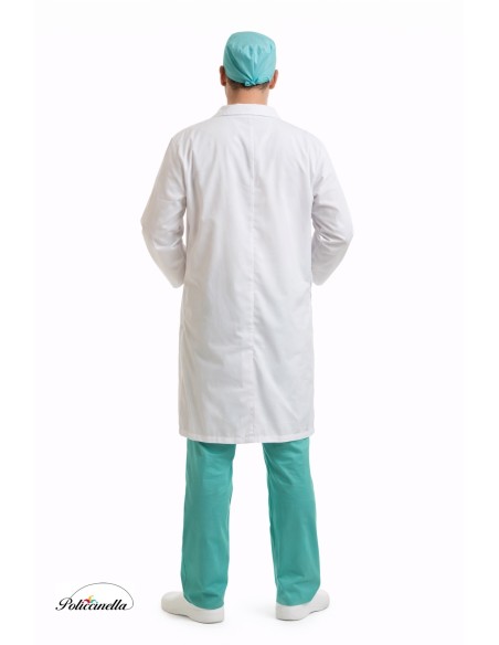 Este traje é composto por um jaleco branco feito de um tecido não tecido (TNT) denso, com dois grandes bolsos laterais. As calças são feitas de malha semielástica com elástico na cintura e bolso interno. O gorro e a máscara combinando, feitos ambos no mesmo tecido das calças, completam o traje.