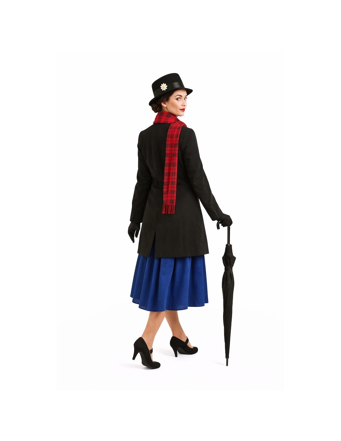 Este belo disfarce é composto por várias peças: um CASACO estilo levita feito de poliéster denso e macio, com elástico na cintura para maior adaptabilidade, fecho com sistema de velcro e botões decorativos; um PEITO branco feito de malha macia com gravata borboleta e laço no pescoço que é colocado por baixo do casaco, criando o efeito óptico de uma camisa; uma SAIA densa e semi-elástica com elástico na cintura e pequeno bolso interno; e por último, o traje é completado com um cachecol denso e um chapéu feito de um feltro macio, embora resistente para manter sua estrutura.
