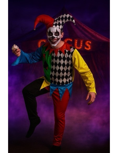 Esta fantasia é feita de malha semi-elástica macia combinada com cetim, o que proporciona conforto e um acabamento elegante. A camiseta comprida possui fecho de velcro na parte de trás do pescoço e apresenta o característico colarinho em forma de picos com sino central que faz som ao se mover. No peito, detalhes envernizados realçam o design com brilho e estilo. As calças a condizer, com cintura elástica e bolso interno prático, garantem um ajuste confortável. O conjunto é complementado com o icônico chapéu de arlequim, feito de cetim foamizado para manter a sua forma, com sinos nas extremidades que proporcionam movimento e autenticidade. Uma fantasia de alta qualidade, alegre e detalhada, perfeita para se destacar em qualquer festa.