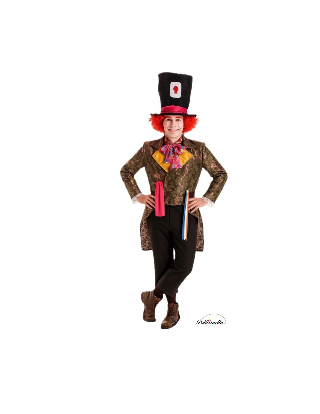 Fato composto por cinco peças: CASACA tecida em cetim, com aparência de tafetá, e estampado cor de pêssego. Lapela de cetim e fecho frontal com velcro. As mangas são decoradas com renda nos punhos, e a casaca com laços coloridos na altura da cintura. CALÇA de poliéster denso com bolso interno e elástico na cintura. LENÇO de cetim estampado para fazer laço no pescoço e CARTOLA de poliéster espumado para manter sua estrutura e forma, com um motivo frontal de filtro aderido à peça.