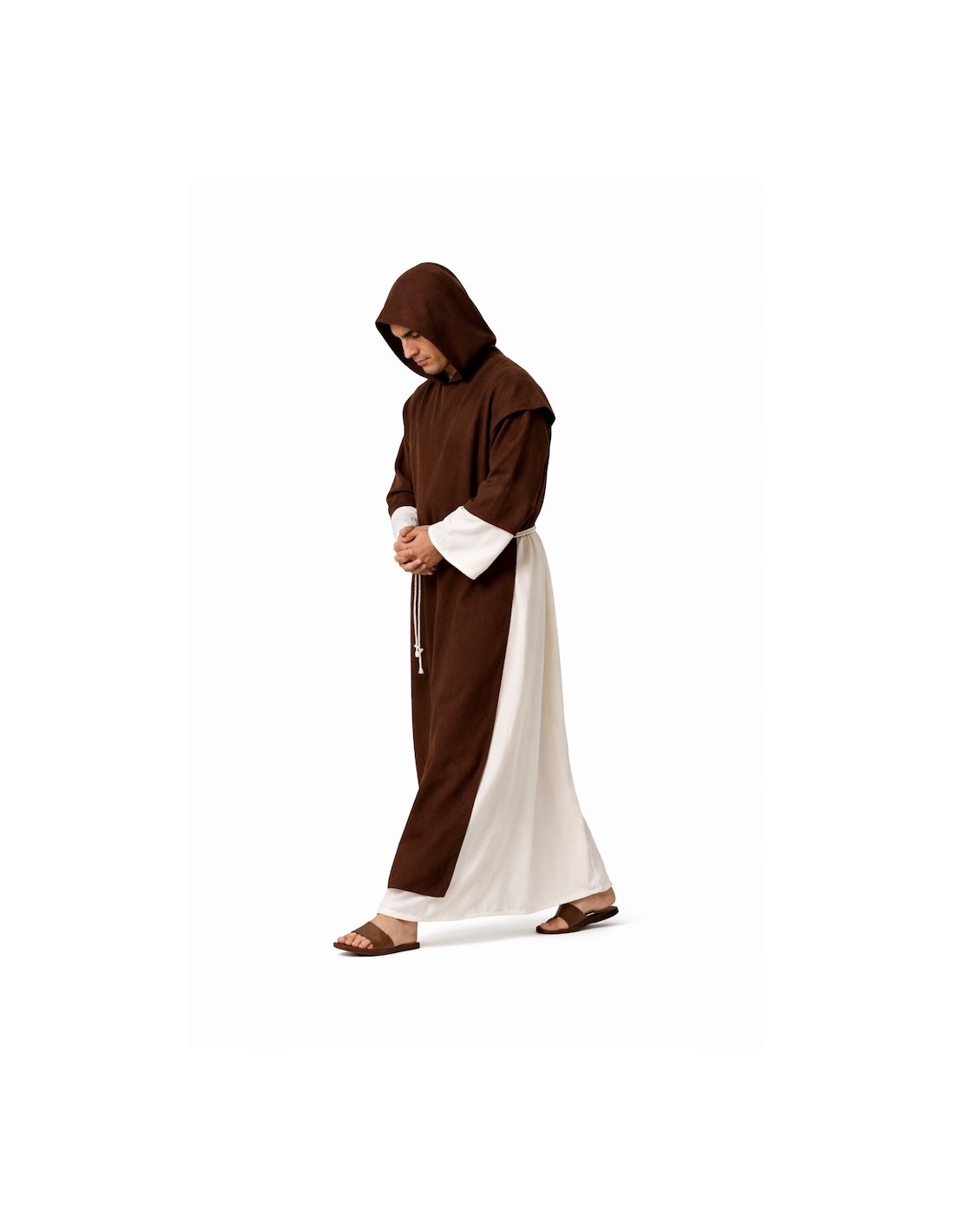 Hábito de monge medieval confeccionado em poliéster denso, de corte longo e reto, com ajuste no pescoço por meio de laço na parte de trás. Inclui escapulário e capuz integrados, feitos de poliéster com toque aveludado, que proporcionam textura e contraste visual. O conjunto é complementado com um cordão funcional na cintura para regular o ajuste e reforçar a silhueta tradicional do hábito monástico.