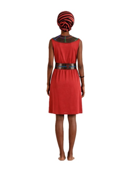 Elegante vestido confeccionado em um suave tecido de malha semielástico, com fecho de velcro no pescoço e mangas de gaze semitransparente que conferem leveza. Destaca-se o seu colar do tipo tribal, feito em poliéster espumado para dar corpo, decorado com ondulações de cores e peças de feltro costuradas, com fecho traseiro de velcro. O conjunto é complementado por um cinto combinando, do qual parte um avental decorativo com estampa animal print como uma espécie de tapa-sexo. Ideal para representações culturais, eventos escolares ou temáticos. Autêntico e chamativo!