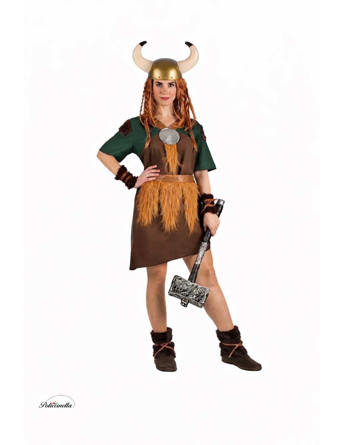 Este disfarce de vikinga apresenta um vestido que combina uma parte frontal feita de poliéster e uma parte traseira feita de um tecido macio semielástico. Inclui detalhes nos ombros com pelo encaracolado marrom escuro, assim como os braceletes e aquecedores, ambos equipados com duas fitas marrom claro para laços decorativos. O decote em V é cercado por poliéster marrom claro que simula couro, e destaca um círculo prateado em poliéster espumado com pelo sintético caindo dele. Complementa-se com um cinto de poliéster marrom claro, também simulando couro, do qual pendura pelo sintético.