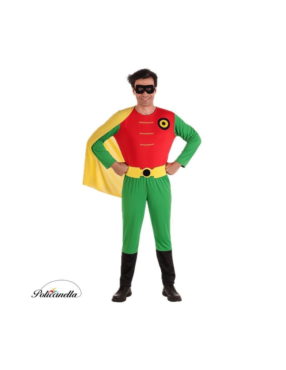 Fantasia heróica! Inclui um macacão confortável em malha macia adornado com uma peça de feltro no peito e detalhes dourados, com fecho de correr invisível nas costas e outro na braguilha para maior conforto. A capa, no mesmo tecido, fixa-se facilmente aos ombros com velcro. Completa o conjunto um cinto estruturado com espuma e fecho de velcro. Uma fantasia confortável, prática e cheia de detalhes para te sentires como um verdadeiro herói!