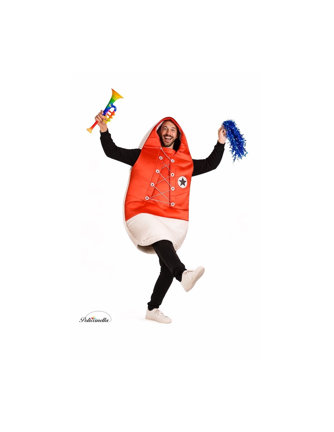 Esta fantasia, de corpo inteiro, é feita na parte da frente com cetim fofinho para fornecer estrutura e forma, enquanto a parte de trás é feita de um tecido denso que confere leveza à peça. Inclui aberturas laterais para os braços, permitindo liberdade de movimento. O capuz está integrado ao traje e os detalhes, feitos com tecido de alta densidade, estão colados na peça. Os cordões dianteiros são funcionais e permitem ajustar o traje para diferentes tamanhos.