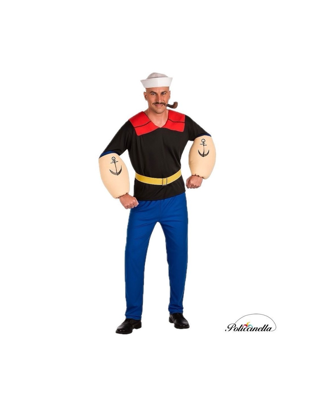 Camiseta de malha macia semielástica, com gola de poliéster espesso e decorada com uma fita preta. O fecho na gola é feito na parte de trás com velcro. As mangas são feitas de poliéster macio para fornecer estrutura e imitar a musculatura do personagem. A calça é feita do mesmo material que a camiseta, possui elástico na cintura e um pequeno bolso interno. Por fim, o cinto é feito de um tecido espesso e consistente, com fivela de plástico com aparência metálica.