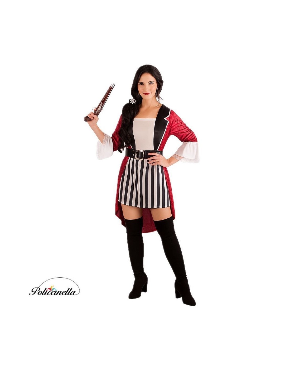 Navegue pelos mares com estilo e atitude! Vestido em veludo cor vinho com lapelas de poliéster sobre um filtro que imita couro preto, decoradas com fitas prateadas no estilo levita. As mangas possuem fita brilhante e terminam em renda delicada com efeito evasê. A parte da frente simula uma camiseta integrada, com renda no peito e saia listrada de poliéster denso e macio. Inclui cinto com fivela decorativa e lenço para o cabelo com caravela pintada.