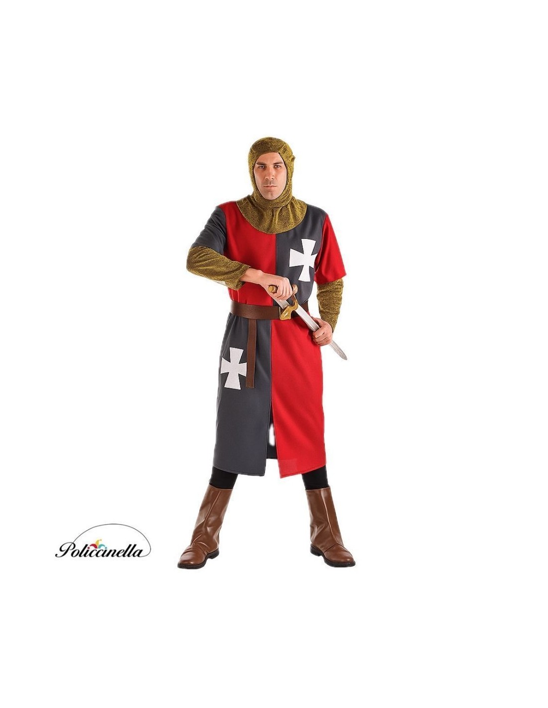 Descrição do traje medieval: Trata-se de uma casaca elaborada em poliéster de toque suave e aveludado, apresentando uma cor vermelha vibrante combinada com cinza escuro. Incorpora duas cruzes brancas feitas de um tecido denso, costuradas de maneira precisa. Além disso, inclui um cinto fabricado em poliéster que imita couro na cor marrom escuro, equipado com uma fivela de plástico. A fantasia é complementada por uma camisa dourada de malha elástica, projetada para harmonizar com as mangas da casaca.