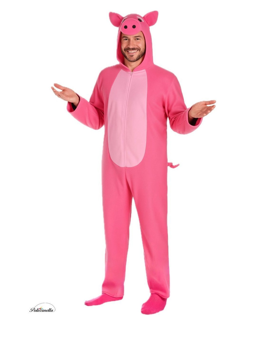 Fantasia adorável de porquinho com macacão de corpo inteiro, confeccionada em tecido tipo pelúcia de toque super suave e agradável, com zíper invisível na frente. O capuz integrado, no mesmo material, é forrado para manter sua forma, com olhos e nariz em feltro denso. Na parte de trás, o rabo simpático enrolado tem um arame interno para moldá-lo e manter sua forma. Leve, confortável e com acabamentos de alta qualidade.