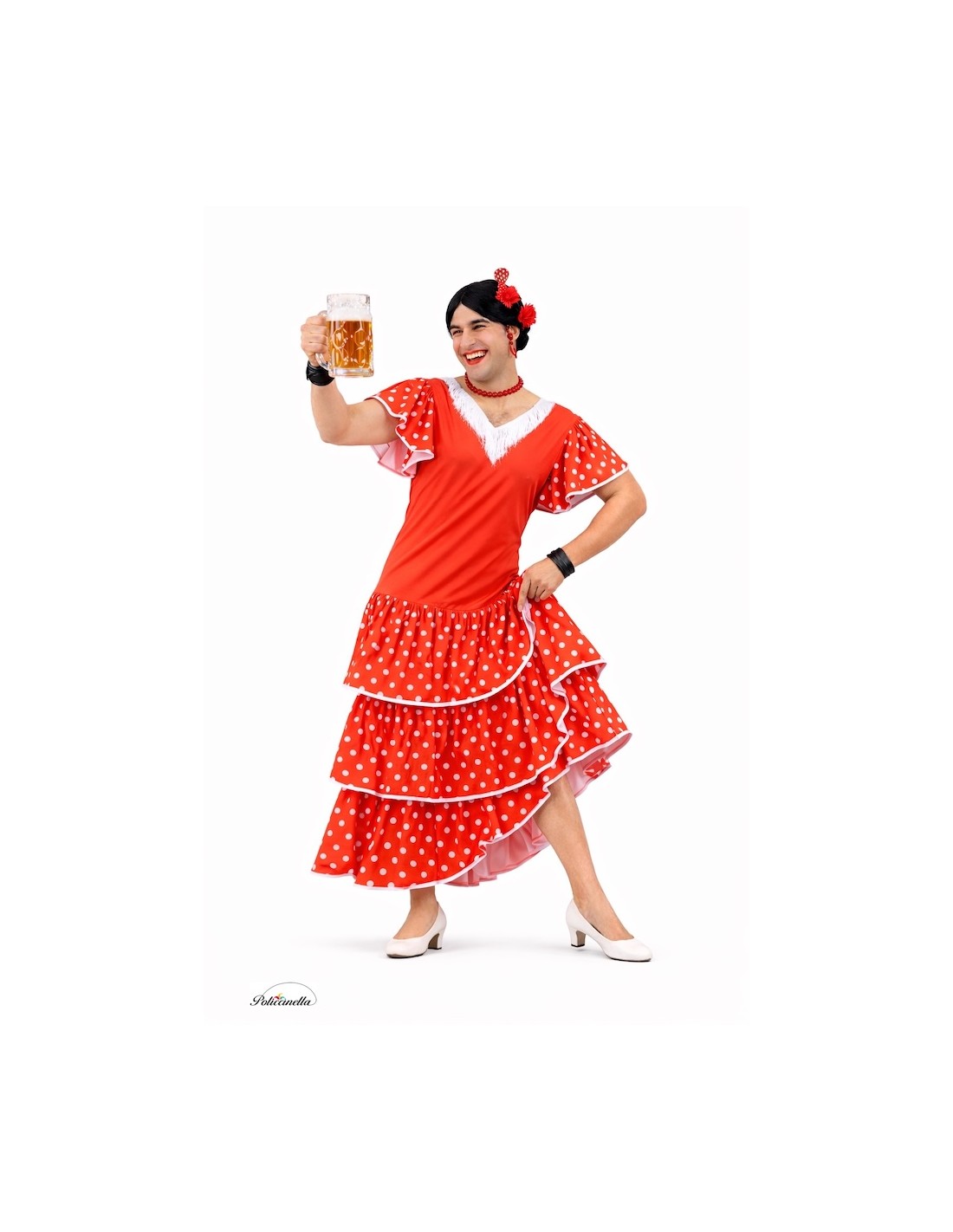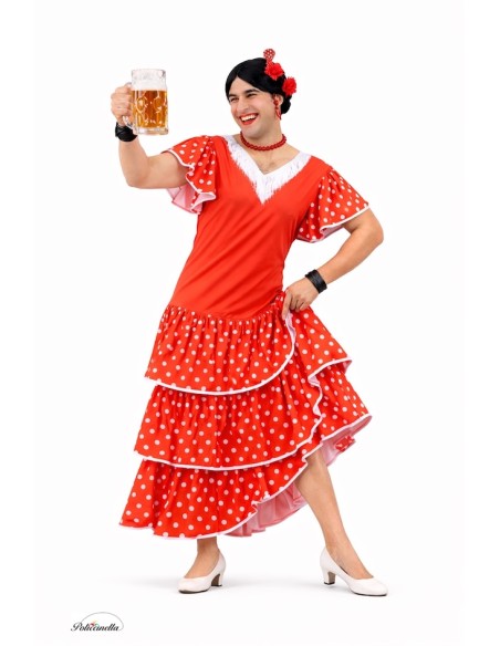 Divertida fantasia de sevilhana para homem, ideal para despedidas e festas cheias de humor. Confeccionada em suave malha semi-elástica, com babados de poliéster leve decorados com fitas de cetim. O decote dianteiro e traseiro apresenta os clássicos franjas, e no peito possui esponjas internas para dar volume e acentuar o toque cômico. Confortável, leve e com todos os detalhes para não passar despercebido.