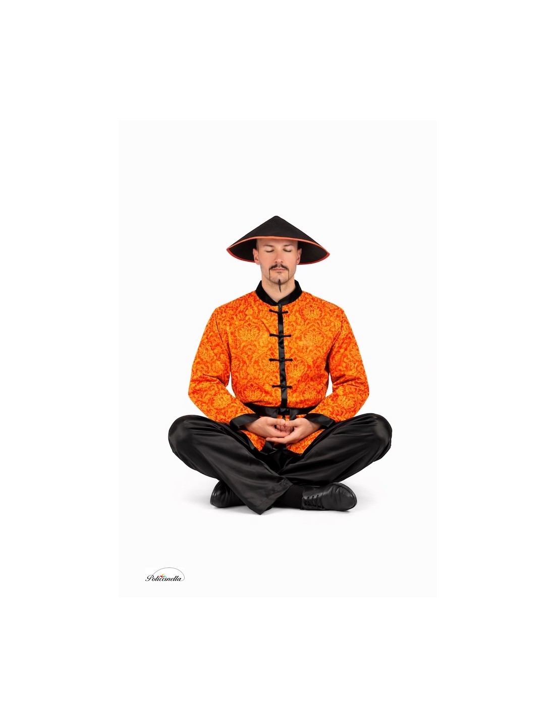 Conjunto inspirado no clássico traje chinês, composto por uma camisa de cetim suave com design tipo tangzhuang, simulando o típico fecho e gola mao. Ajusta-se confortavelmente com velcro na parte de trás do pescoço. As calças são confeccionadas no mesmo material, têm cintura elástica e um pequeno bolso interior. O conjunto é complementado pelo tradicional chapéu chinês, espumado e equipado com uma tiara interna para garantir um ajuste firme, confortável e evitar que caia. E, por fim, inclui um cinto de cetim, no mesmo tom das calças. Autêntico e cheio de charme oriental!