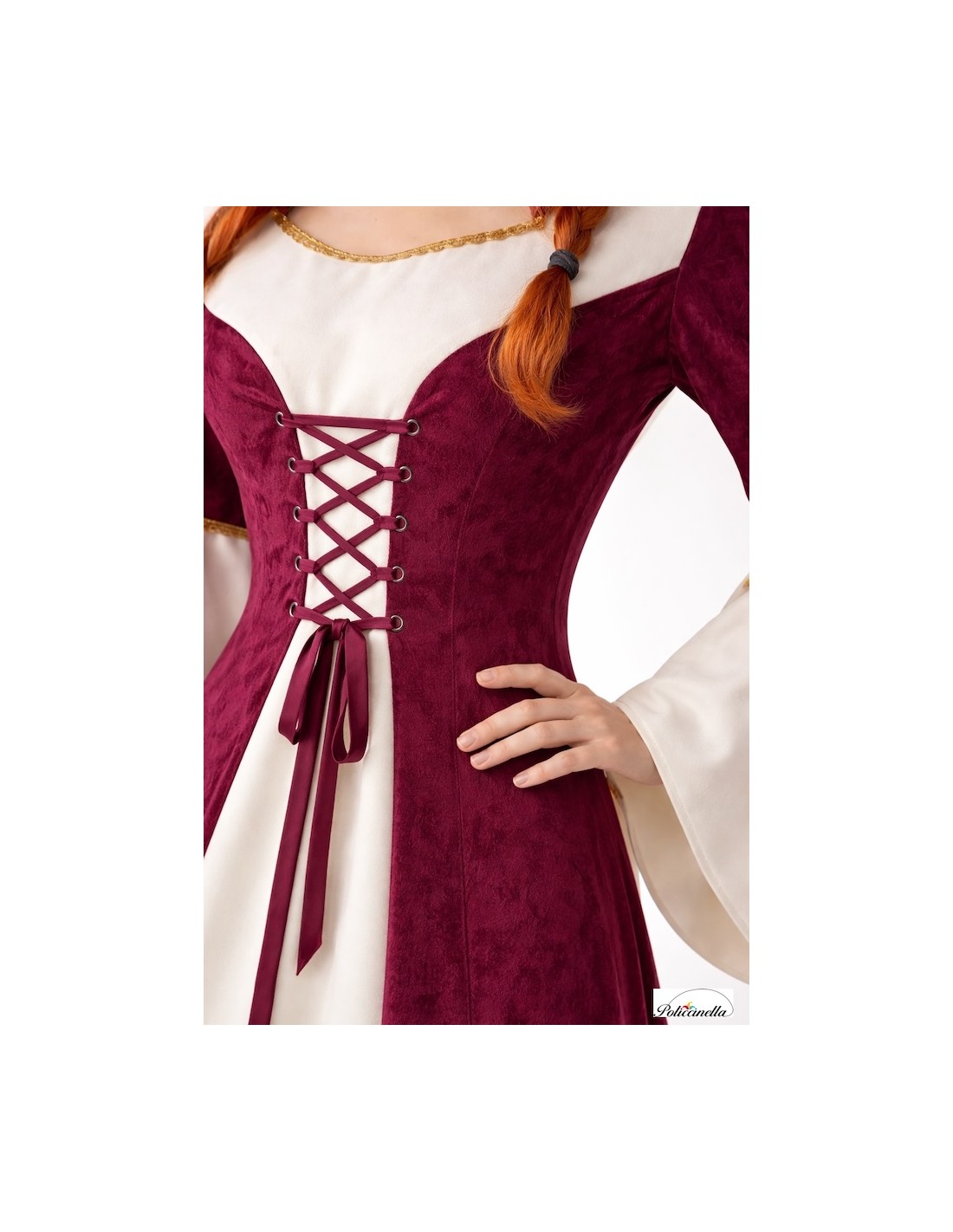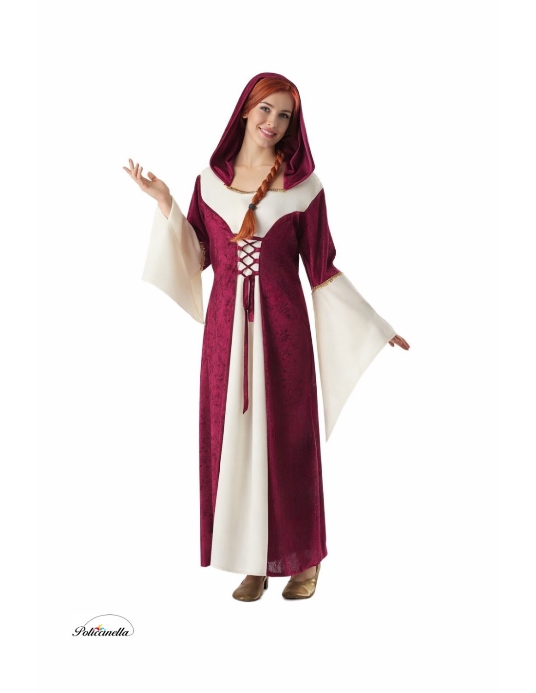 Trata-se de um bonito vestido longo confeccionado em poliéster grosso, sobre o qual foi sobreposto uma suave capa de veludo cor vinho. Essa técnica cria a ilusão de duas peças, mas na verdade é uma só, proporcionando maior liberdade de movimento e conforto. O vestido ajusta-se ao corpo através de cordões na região do tórax, um elemento característico da época. A peça é acompanhada por um capuz confeccionado com o mesmo tecido e tom da capa, e a decoração presente nas mangas e no pescoço consiste em uma elegante passamanaria dourada.