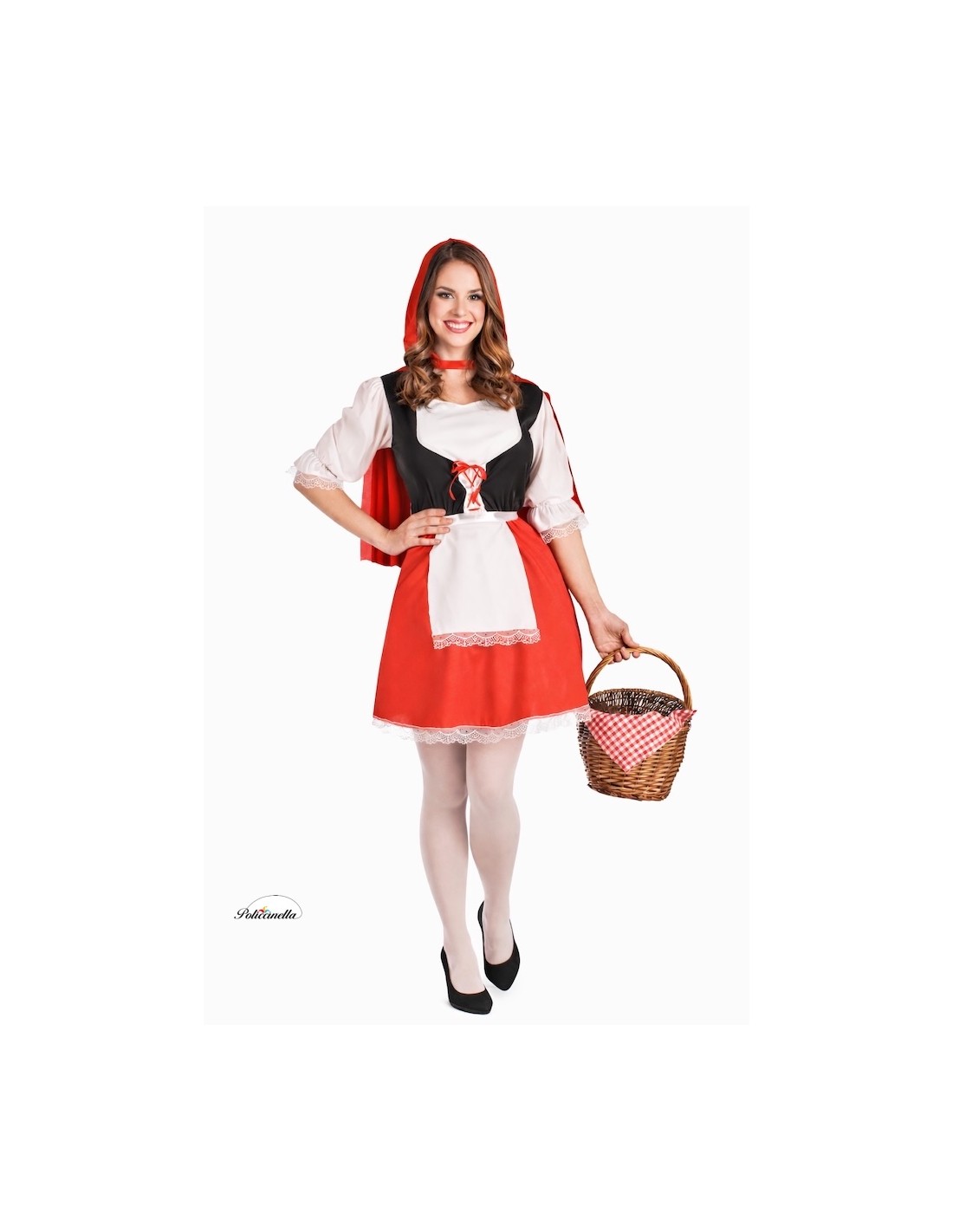 Este clássico traje de conto de fadas consiste em um vestido confeccionado em malha macia na parte superior, com colete integrado que simula duas peças em uma. Inclui uma fita vermelha de cetim na parte da frente para amarrar com o característico nó em zigue-zague. Possui elástico na cintura e cotovelos, enquanto a saia é feita de poliéster denso com enfeite de renda, assim como as mangas. Acompanha o vestido a capa característica com capuz, feita em malha, com fecho de velcro no pescoço e o mesmo enfeite de renda que o vestido, além de um pequeno avental no mesmo tecido e enfeites que a capa, com um laço de cetim nas costas.
