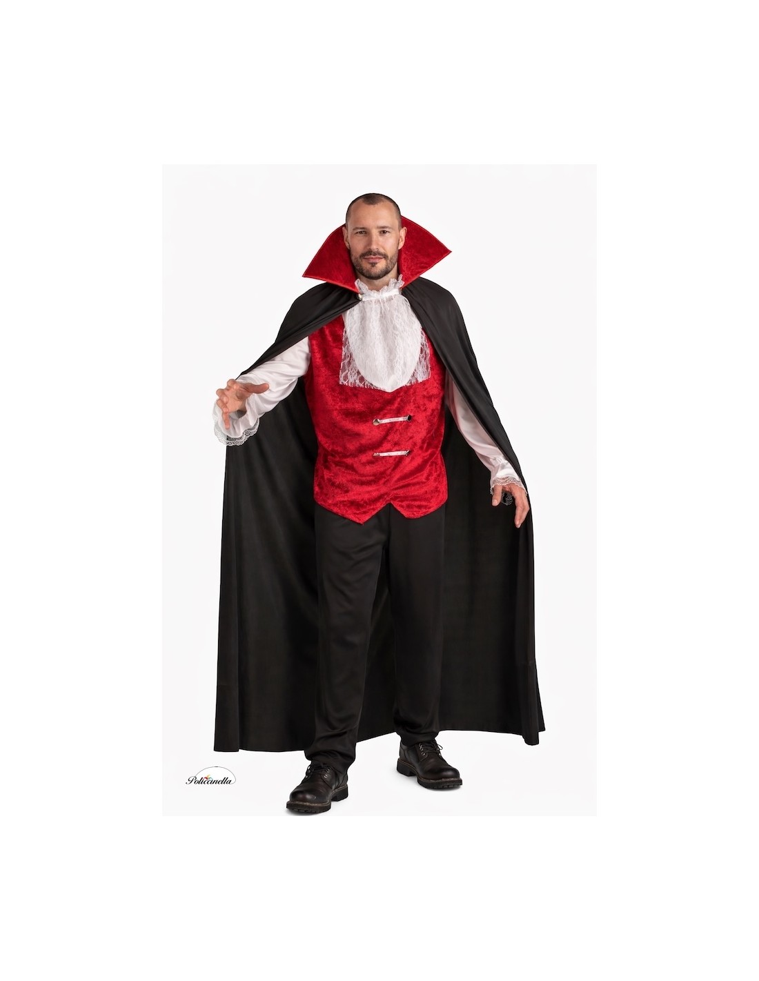 Disfarce distinto de vampiro, elegante e cheio de detalhes. Inclui uma camiseta de malha macia semi-elástica com renda e punhos franzidos, com um colete de veludo bordô integrado, dando a impressão de ser duas peças, decorado com botões e fitas prateadas. Fechamento traseiro com velcro e elástico nas costas para um ajuste perfeito. A camiseta é complementada por um lenço de renda no pescoço. A calça de malha com elástico e bolso interno proporciona conforto. A icônica capa, com gola de veludo estruturado e decorada com botões e fitas prateadas, fecha na frente com velcro. Um conjunto harmonioso e ideal para se destacar em qualquer festa.