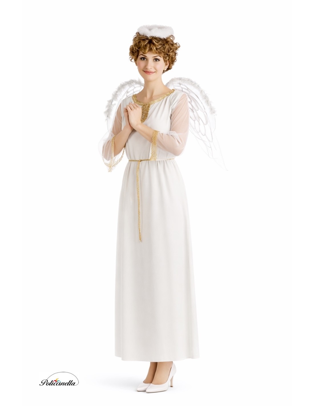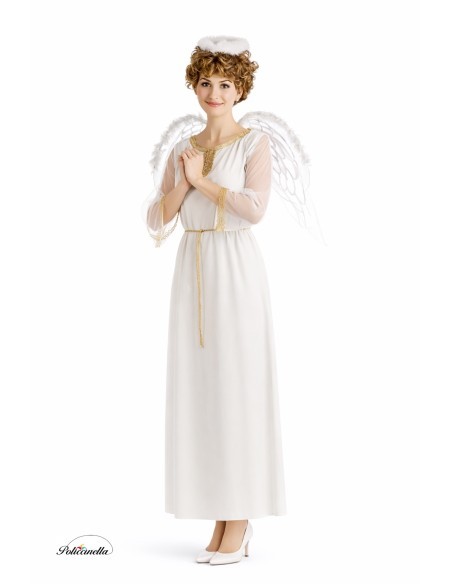 Fantasia doce e encantadora de anjo, perfeita para brilhar em qualquer ocasião. Inclui um vestido de tecido pêssego com gola e decote decorados com delicada renda dourada. As mangas, de tule macio, terminam com renda e renda a condizer. Um cordão de nylon na cintura permite ajustá-lo com um bonito laço. Completa-se com umas leves asas de malha extra macia, adornadas com purpurina prateada que desenha a sua forma e que se seguram com cordões nos ombros. Para finalizar, a clássica tiara decorada com uma suave plumagem. Um conjunto delicado e cheio de luz.