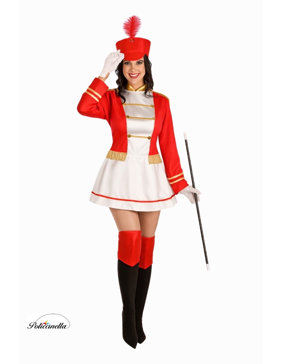 Este popular e chamativo traje de majorette inclui um elegante vestido de cetim macio com corte na cintura, fecho de velcro na nuca e elástico atrás para um ajuste favorecedor. O colarinho e ombreiras em cetim dourado fornecem presença e estão decorados com franjas. O peito possui botões dourados não funcionais e fitas combinando, assim como as mangas. A saia é finalizada com fita de cetim vermelho. Complete o conjunto com polainas de cetim foanizado com velcro e o clássico chapéu estruturado, com penas, peça tipo joia, fita dourada na viseira e elástico atrás para um ajuste perfeito.
