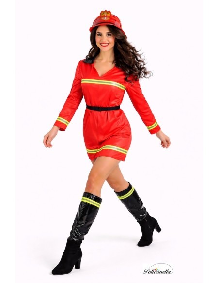 Fato de bombeira super legal e completo, de alta qualidade, é um vestido em malha semi-elástica, com acabamento visual tipo couro e gola de efeito envernizado. Inclui fitas refletoras (não fluorescentes) no peito, mangas e parte inferior. Inclui protetores para as botas, de efeito envernizado decorados com as mesmas fitas para criar um conjunto harmonioso. E é completado com um cinto de nylon com fivela, opcional para ajustar a cintura.