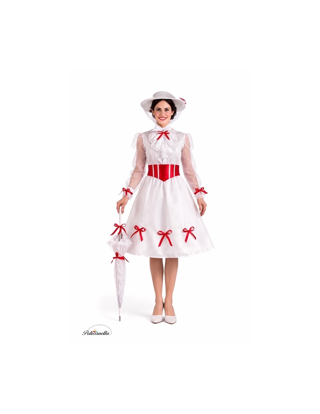 Um design elegante e cheio de encanto. O vestido é confeccionado em suave malha semi-elástica, com fecho no pescoço através de velcro e elástico na cintura, de onde parte uma saia ampla em cetim denso com bastante volume. As mangas, em chiffon semi-transparente, trazem leveza e são decoradas com delicados laços vermelhos que também realçam os punhos, o pescoço e a bainha da saia. No peito, uma peça com renda branca acrescenta distinção. Para ajustar, inclui um cinto de cetim espumado com laço na parte de trás. O conjunto é complementado com um chapéu foamizado, para manter sua forma e estrutura impecáveis, adornado com laços vermelhos e um elegante véu de tule integrado. Uma fantasia de grande confecção, detalhada e com um acabamento de qualidade.