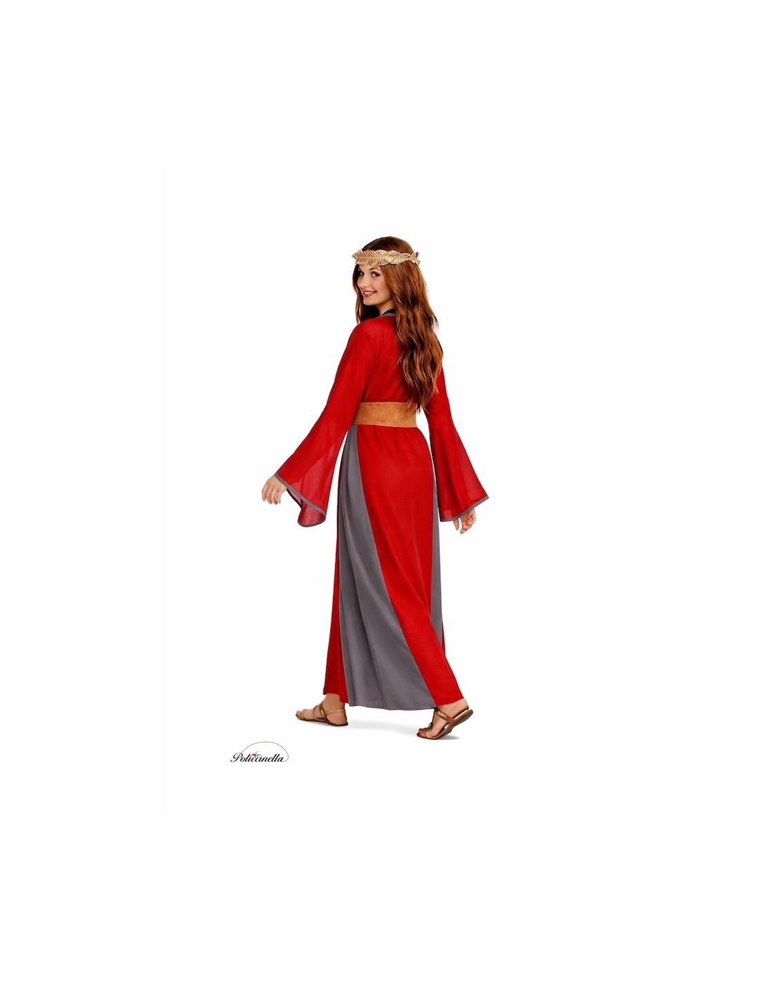 Túnica de toque aveludado com fecho no pescoço na parte de trás através de um sistema de velcro. Decorada com detalhes cinza que harmonizam com o pescoço e parte do vestido. Completa-se com um cinto feito do mesmo tecido que a túnica e revestido por uma rede dourada. O cinto ajusta-se na parte de trás com um laço.