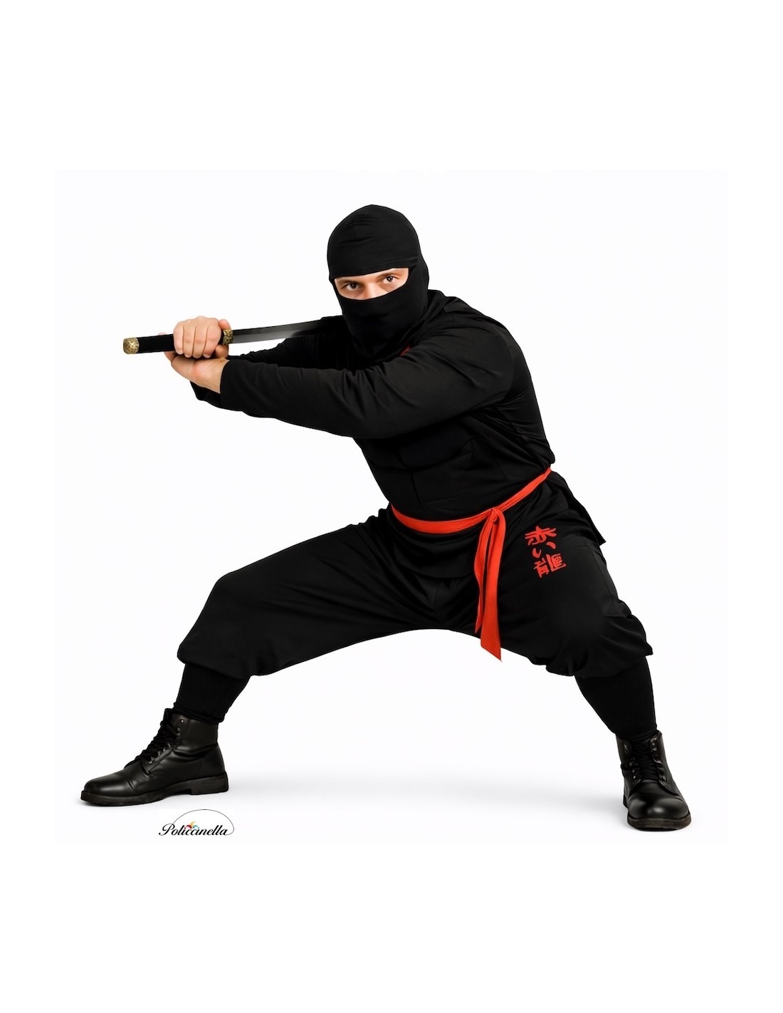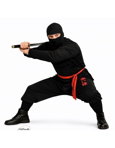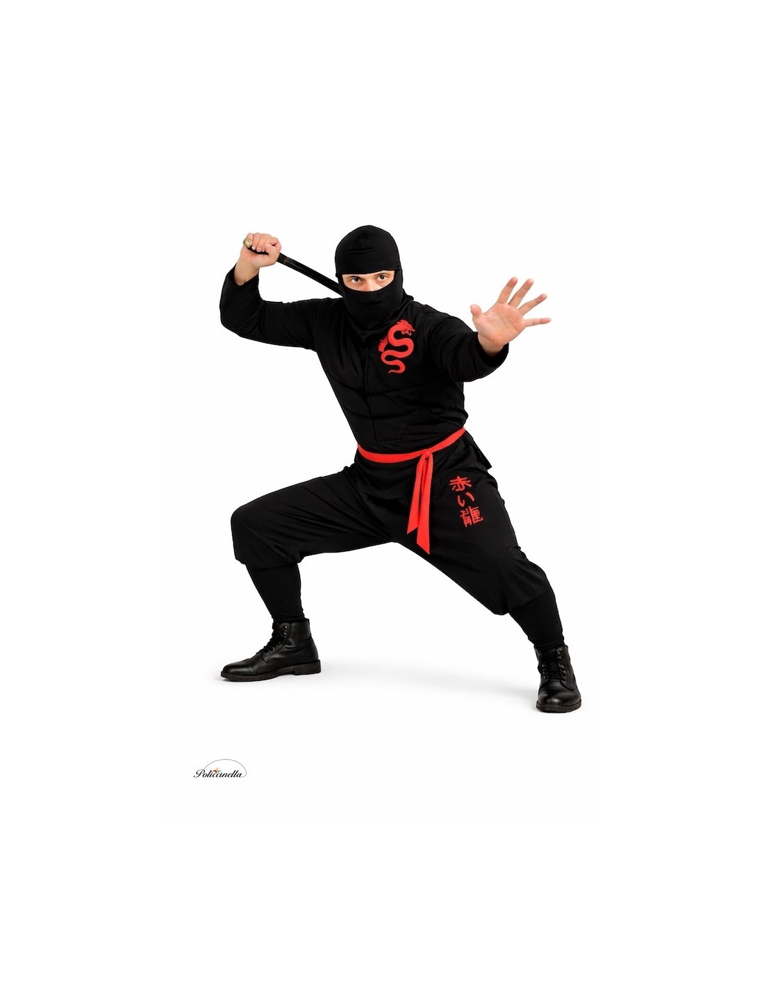 Este fato completo e confortável de ninja é confeccionado em malha semi-elástica macia, ideal para se movimentar com agilidade. A camiseta fecha atrás do pescoço com velcro e possui acolchoados nos braços e no peito que simulam a musculatura do personagem. Na frente, um dragão impresso no próprio tecido adiciona força visual ao design. A calça combinando, com elástico na cintura e bolso interno, inclui barras espumadas que cobrem firmemente a parte de cima das botas. Completa-se com um casaco do mesmo tecido, com fecho no pescoço e fita para ajustar na cintura. Leve, resistente e de alta qualidade.