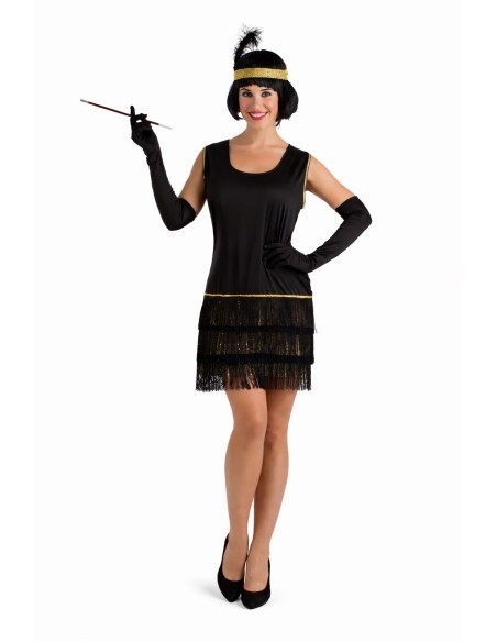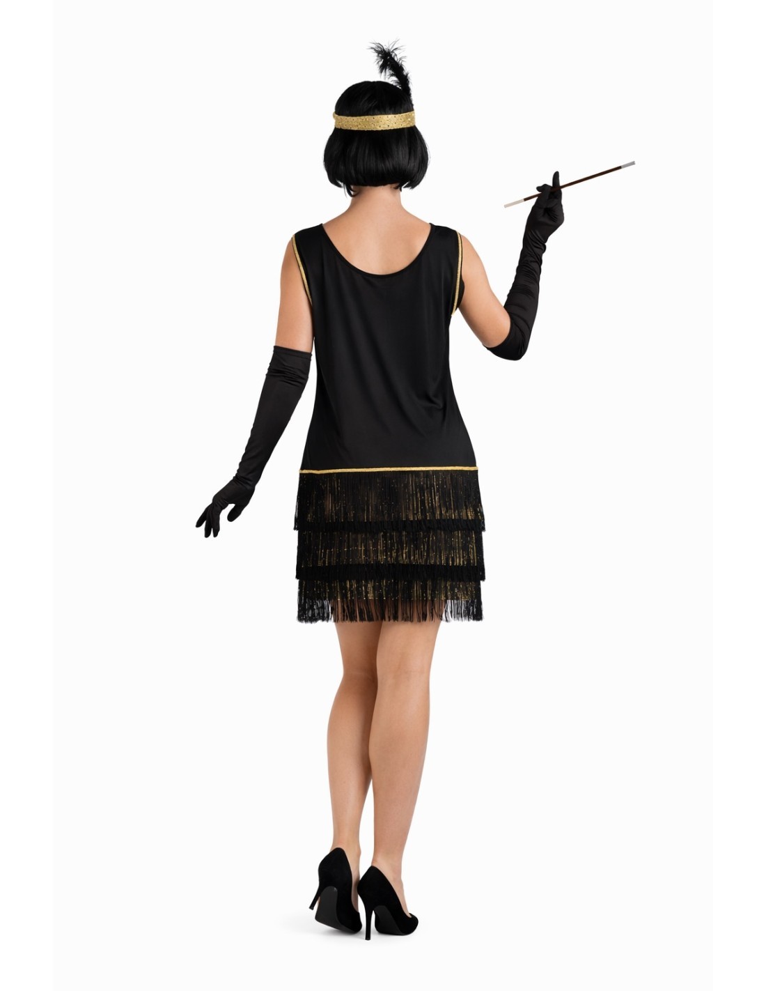 Este encantador vestido de charleston evoca todo o glamour dos anos 20 com um design confortável e sofisticado. Confeccionado em malha semi-elástica suave, apresenta um corte clássico adornado com detalhes dourados nos ombros e uma elegante faixa decorativa na altura do quadril. A parte inferior do vestido é feita de tecido dourado com lantejoulas aplicadas, realçada por três fileiras de franjas brilhantes que trazem movimento e ritmo ao caminhar. Inclui uma fita elástica para a cabeça, feita em tecido dourado com lantejoulas e finalizada com uma pena icônica na frente para completar o visual.