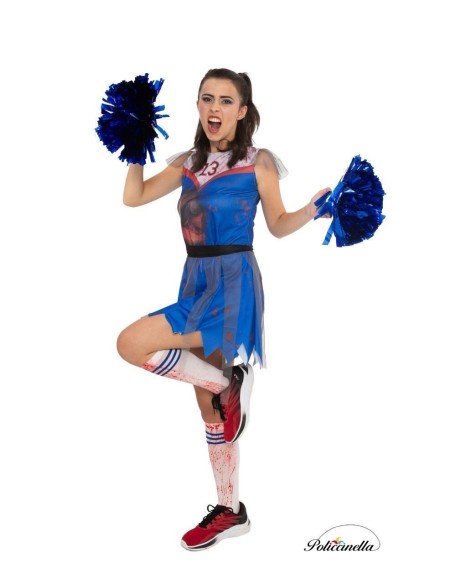 Este traje de animadora zumbi é composto por um vestido azul elétrico, feito de malha de máquina com um design impresso digitalmente. O vestido fecha na parte de trás com um sistema de velcro e inclui um cinto na cintura que também fecha com velcro e é decorado com tiras de tule que caem sobre a saia. Além disso, possui um detalhe decorativo de tule cinza nos ombros. O traje é complementado por meias altas que simulam respingos de sangue e três listras azuis perto da parte superior.