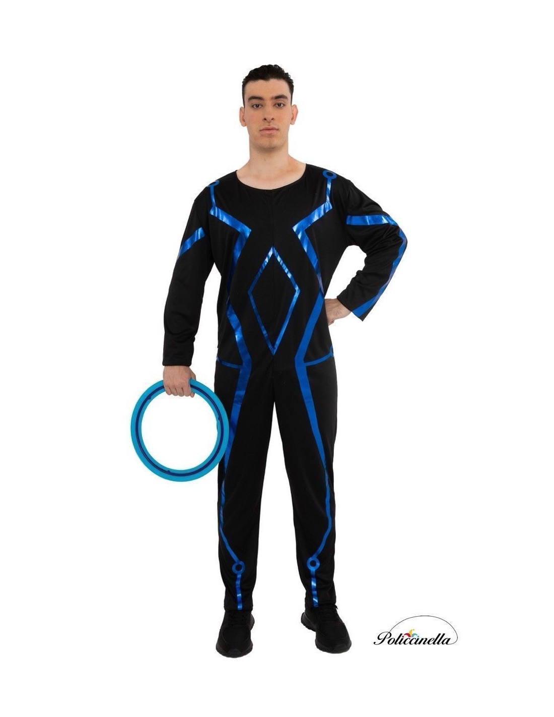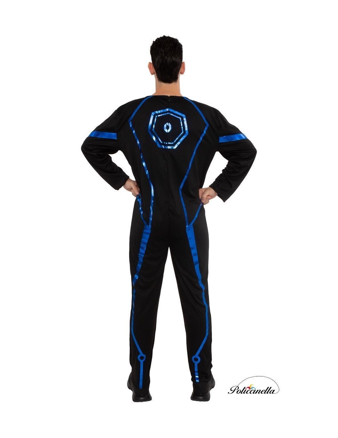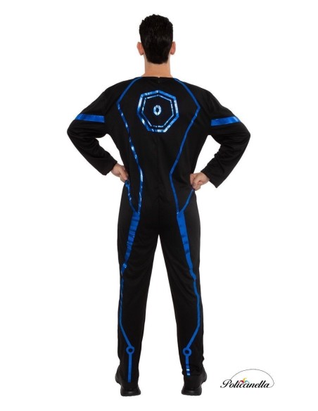 Este confortável macacão, feito em malha semi-elástica, fecha na parte de trás com zíper invisível e possui decoração de desenhos aderidos à peça em cor azul metálico.