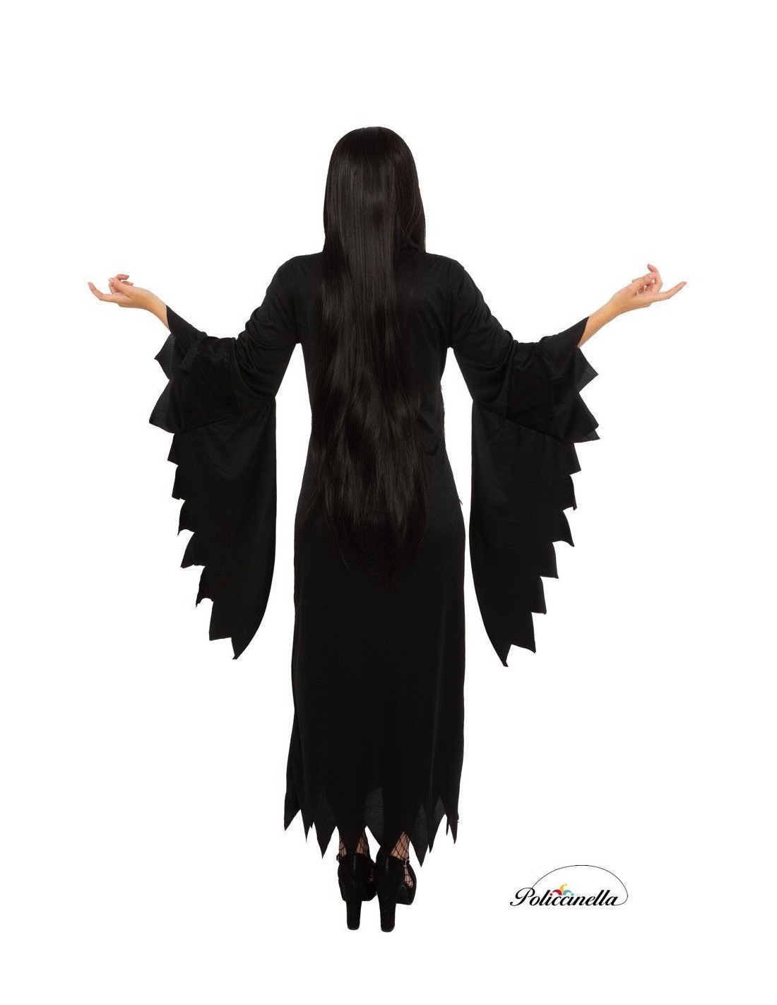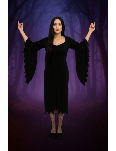 Este vestido, feito em malha de máquina semi-elástica, possui um decote em forma de semicoração com lapela no pescoço e abertura frontal até o joelho. As mangas, de comprimento médio, possuem uma sobremanga que chega quase até os tornozelos. O vestido tem costura abaixo do peito para realçar a figura e vem com um cinto que se ajusta ao contorno por meio de um sistema de velcro.