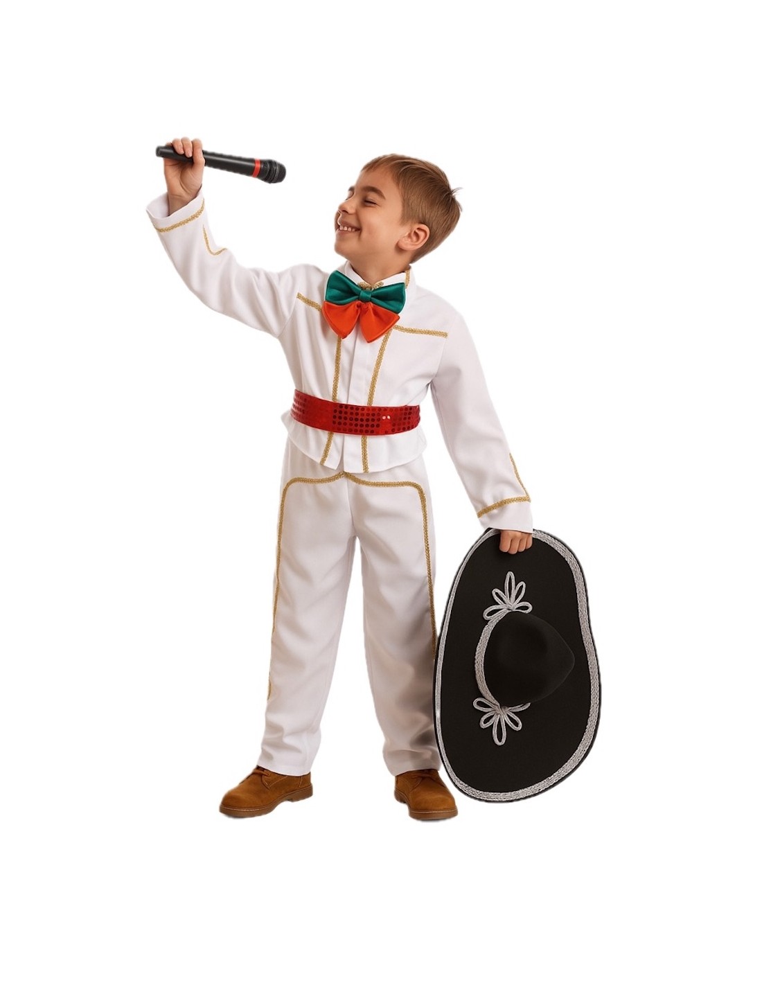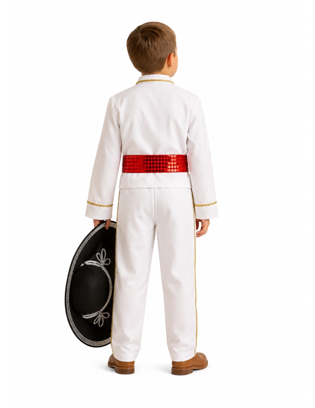 Conjunto de duas peças feito de poliéster suave e denso, decorado com uma fina passamanaria dourada. A jaqueta possui fecho frontal com velcro, gola tipo mao e gravata borboleta ajustável com velcro. Nas costas, um elástico na altura da cintura proporciona melhor ajuste e forma, complementado com fita vermelha com lantejoulas para um toque festivo. A calça inclui cintura elástica para maior conforto. Ideal para apresentações, festas temáticas e celebrações tradicionais.