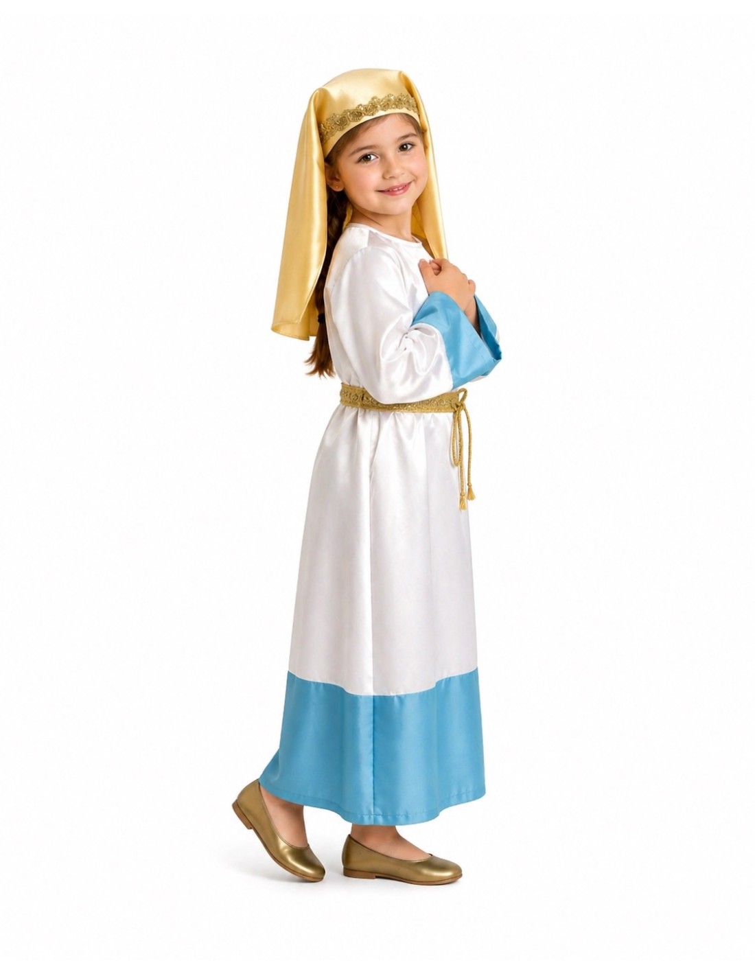 Fantasia de Virgem Maria de alta qualidade, ideal para representações de Natal e eventos religiosos. Inclui uma túnica de cetim macio, com fecho no pescoço atrás por sistema de velcro e cinto confeccionado em cetim e bonita passamanaria que realça a figura. O véu, também de cetim e decorado na frente por passamanaria, ajusta-se confortavelmente à cabeça, graças à sua borracha interna, garantindo que permaneça no lugar.