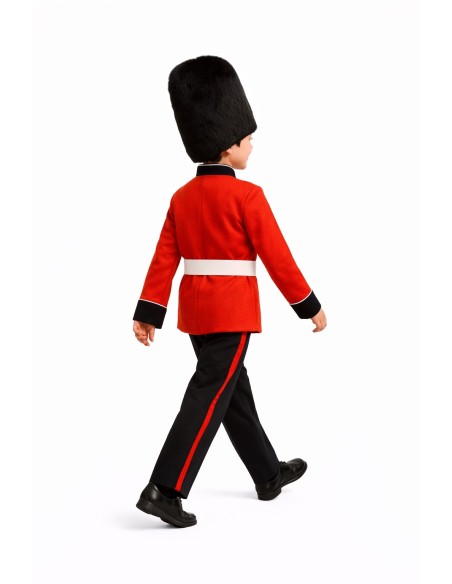 Disfarce clássico da Guarda Inglesa, elegante e com todos os detalhes do uniforme tradicional. Inclui uma jaqueta de poliéster denso, embora suave, com colarinho mao, decorada com fitas brancas e botões, com fecho de velcro na parte de trás do pescoço. As calças, em tecido macio semielástico com elástico na cintura, têm uma fita de cetim vermelha nas laterais. Completa-se com um cinto de aspecto envernizado com fivela de plástico prateada e o emblemático gorro com pelo sintético que caracteriza a personagem, confeccionado em tecido de malha, com elástico na parte de trás para poder adaptá-lo confortavelmente.