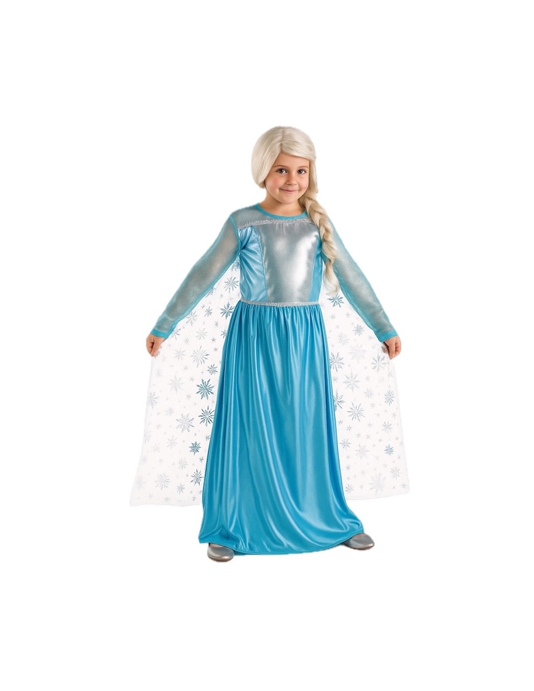 Este lindo disfarce, inspirado no personagem icônico, consiste em um vestido longo de cetim suave denso no característico azul gelo do personagem. A parte da frente incorpora um tecido de poliéster metalizado em azul claro prateado. O decote e as mangas, confeccionados em tule azul com brilhos prateados, proporcionam leveza e elegância. Uma passamanaria prateada divide a parte da frente e o decote, repetindo-se na altura da cintura, de onde cai a saia. Inclui uma capa prateada de tule com desenhos impressos prateados, costurada ao vestido, que realça seu design. Fecha com um sistema de velcro nas costas para um ajuste confortável e seguro.