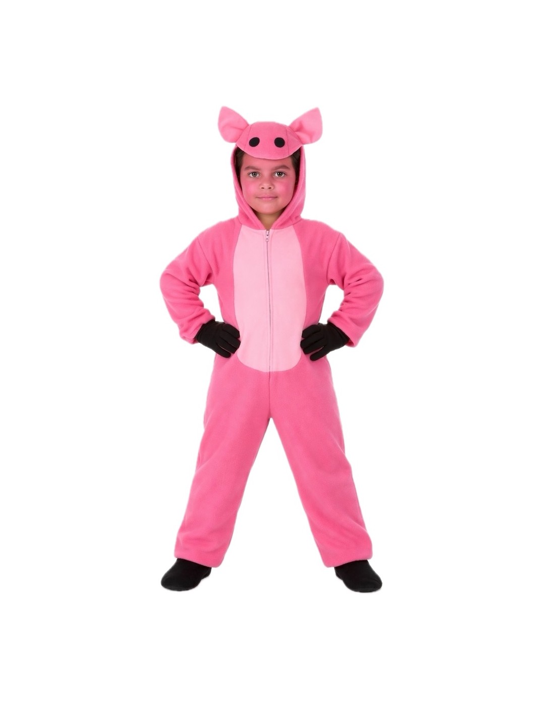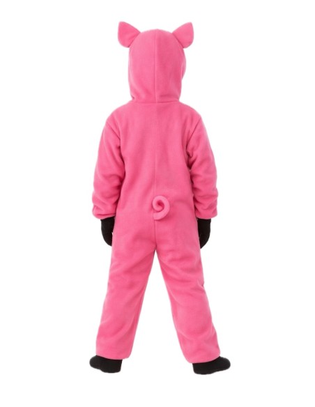 Adorável fantasia de porquinho com macacão de corpo inteiro, feita em tecido tipo pelúcia de toque super macio e agradável, com zíper invisível na frente. O capuz integrado, feito do mesmo material, é acolchoado para manter sua forma, com olhos e nariz de feltro denso aplicados. Na parte de trás, a cauda simpática enrolada possui um arame interno para moldá-la e manter sua forma. Leve, confortável e com acabamentos de alta qualidade.