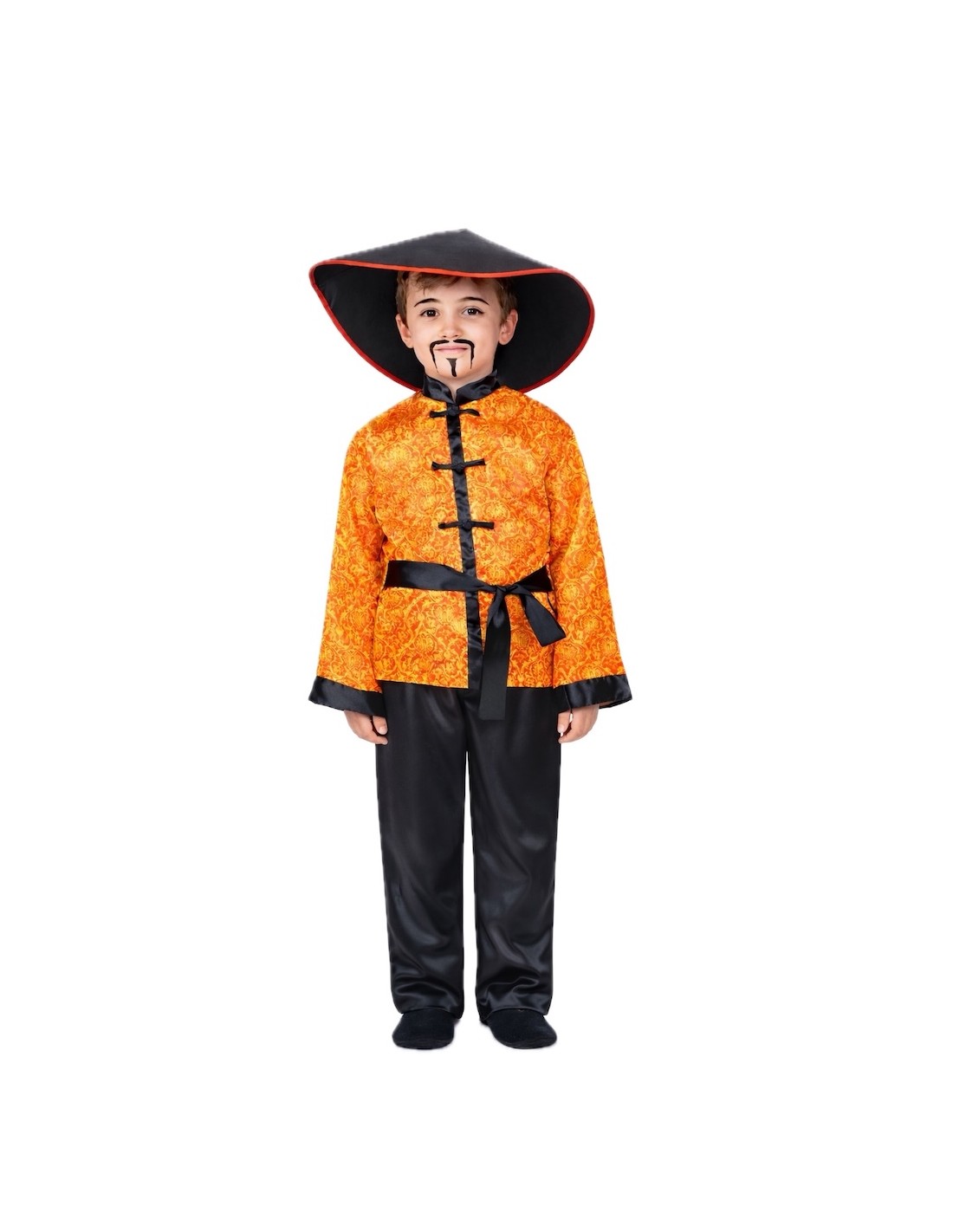 Conjunto inspirado no clássico traje chinês, composto por uma camisa de cetim suave com design tipo tangzhuang, simulando o típico fecho e gola mao. Ajusta-se confortavelmente com velcro na parte de trás do pescoço. As calças, feitas do mesmo material, possuem cintura elástica e um pequeno bolso interno. O conjunto é complementado pelo tradicional chapéu chinês, acolchoado e equipado com uma faixa interior para garantir um ajuste firme, confortável e evitar que caia. E, por último, inclui um cinto de cetim, no mesmo tom das calças. Autêntico e cheio de charme oriental!