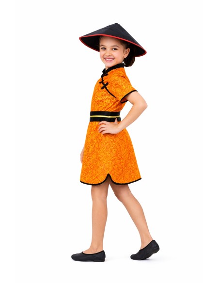 Vestido inspirado no clássico traje chinês, feito de cetim suave com design tipo tangzhuang. Simula o típico fecho diagonal e gola mao. Ajusta-se confortavelmente com zíper invisível nas costas. Tanto a bainha da saia quanto as mangas são ribeteadas para harmonizar com a gola e o adorno lateral do peito. O conjunto é complementado com o tradicional chapéu chinês foanizado, equipado com uma tiara interna para garantir um ajuste firme e confortável, evitando que caia. E cinto, também foanizado com ajuste nas costas através de uma peça de velcro. Uma peça autêntica e cheia de charme oriental.