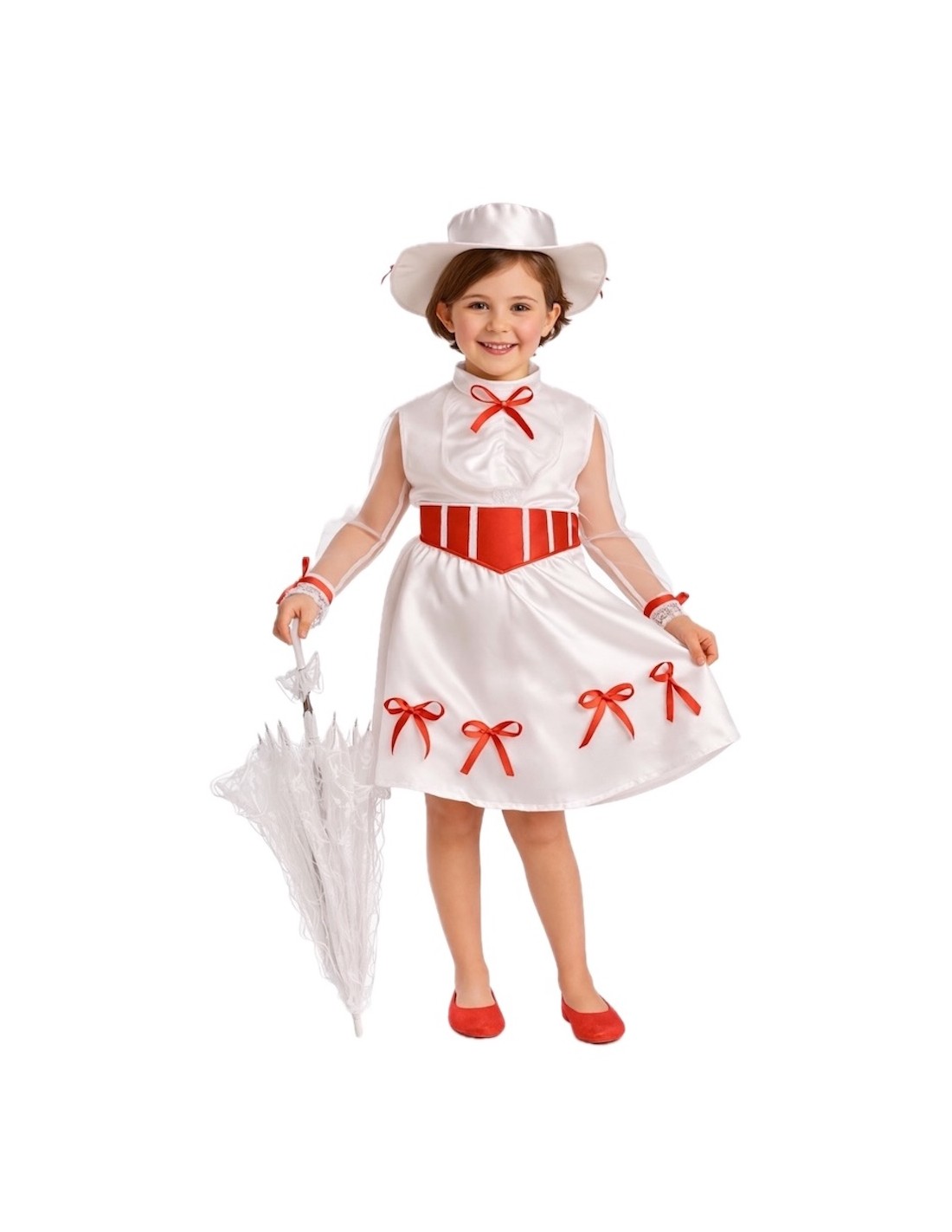 Um design elegante e cheio de charme. O vestido é confeccionado em tecido macio de malha semi-elástica, com fecho no pescoço por velcro e elástico na cintura de onde parte uma saia ampla em cetim denso com grande volume. As mangas, em chiffon semitransparente, trazem leveza e são decoradas com delicados laços vermelhos que também realçam os punhos, gola e bainha da saia. No peito, uma peça com renda branca adiciona distinção. Para ajustar, inclui um cinto de cetim espumado com laço traseiro. O conjunto é complementado com um chapéu de espuma também, para manter sua forma e estrutura impecável, decorado com laços vermelhos e um elegante véu de tule integrado. Uma fantasia de grande confeção, detalhada e com um acabamento de qualidade.