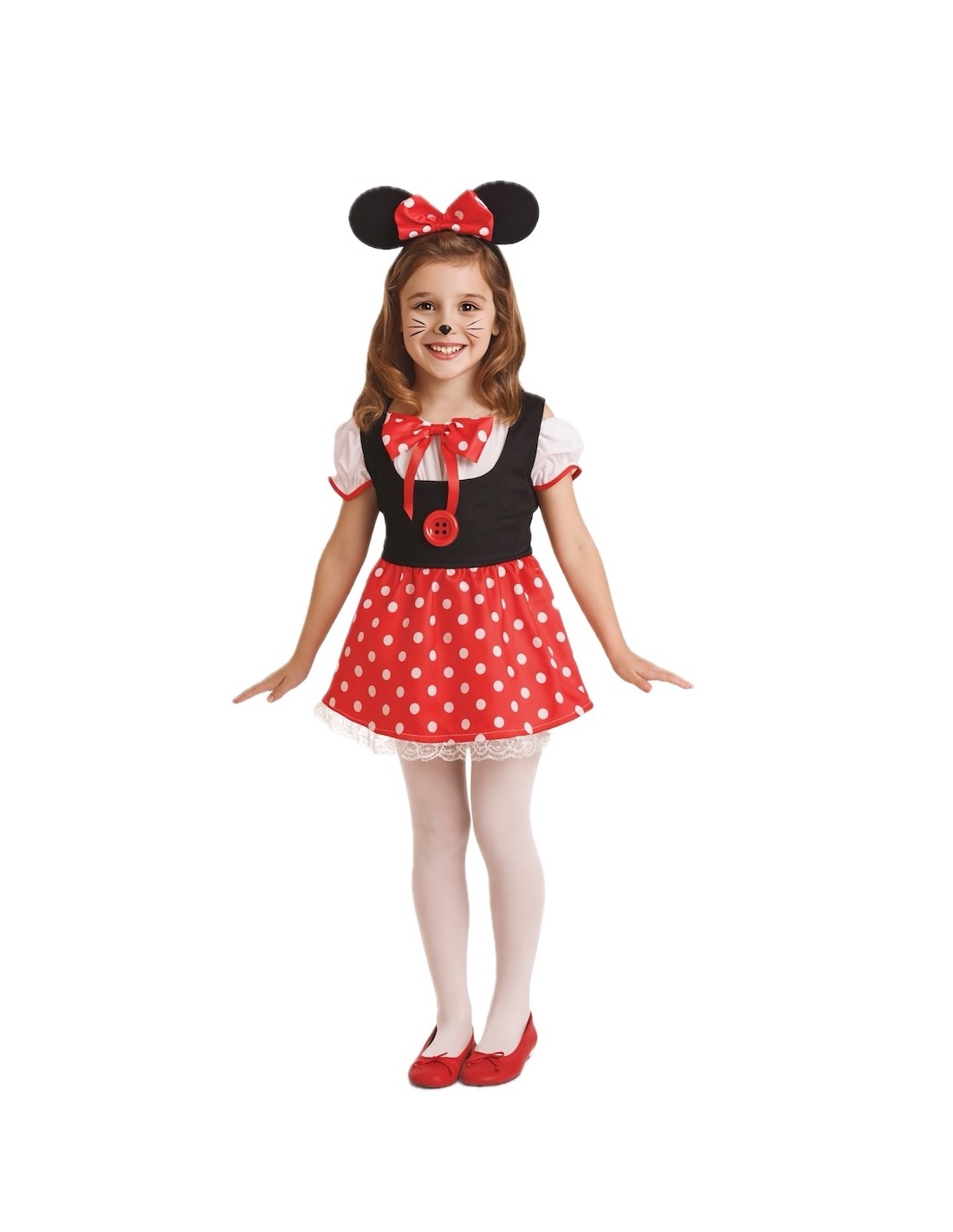 Vestido coquete de cetim vermelho com bolinhas brancas de tecido grosso e com corpo, nada transparente. Mangas bufantes com elástico, gola estruturada e laço preto costurado no peito. As costas são de malha para maior conforto e a saia, levemente pregueada, termina com um babado de cetim suave decorado com fita branca. Inclui cinto com fivela de plástico com efeito metálico, confeccionado sobre uma peça de TNT para dar corpo e estrutura, com fecho de velcro atrás e tiara com orelhas de feltro denso e laço de cetim.