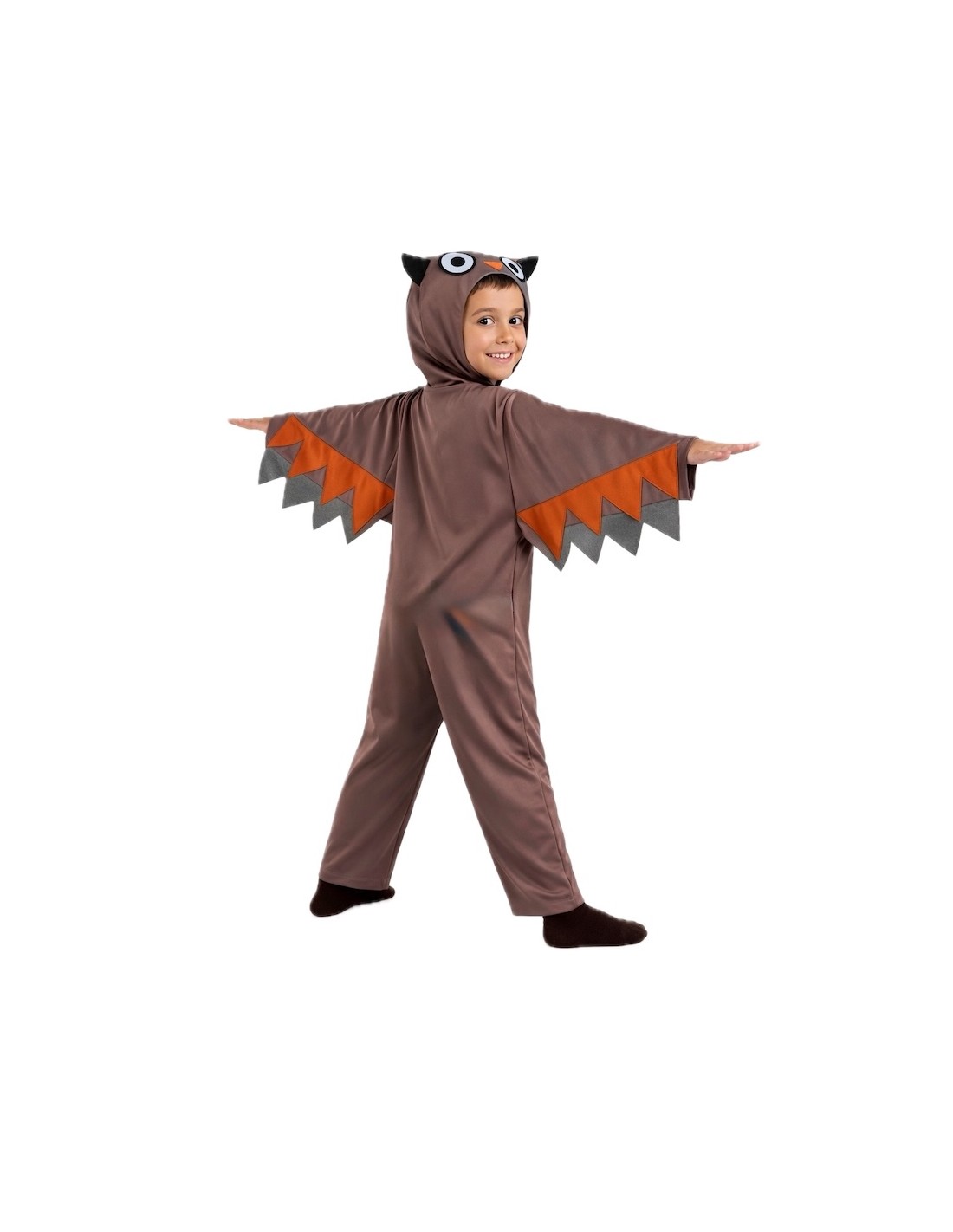 Macacão completo feito em malha de máquina semi-elástica suave que se adapta confortavelmente ao corpo. Possui um capuz integrado, estruturado com espuma para dar forma e corpo, decorado com feltros costurados de alta densidade, orelhas fofas por dentro e um toque gracioso de pelo suave tipo boá na parte superior. O zíper frontal fica oculto sob uma peça de toque aveludado que se fecha com velcro no pescoço, proporcionando um acabamento polido. As mangas são adornadas com aplicações em forma de penas, também de toque aveludado, que evocam detalhadamente a plumagem da coruja. É um design leve, quente e muito confortável de usar.