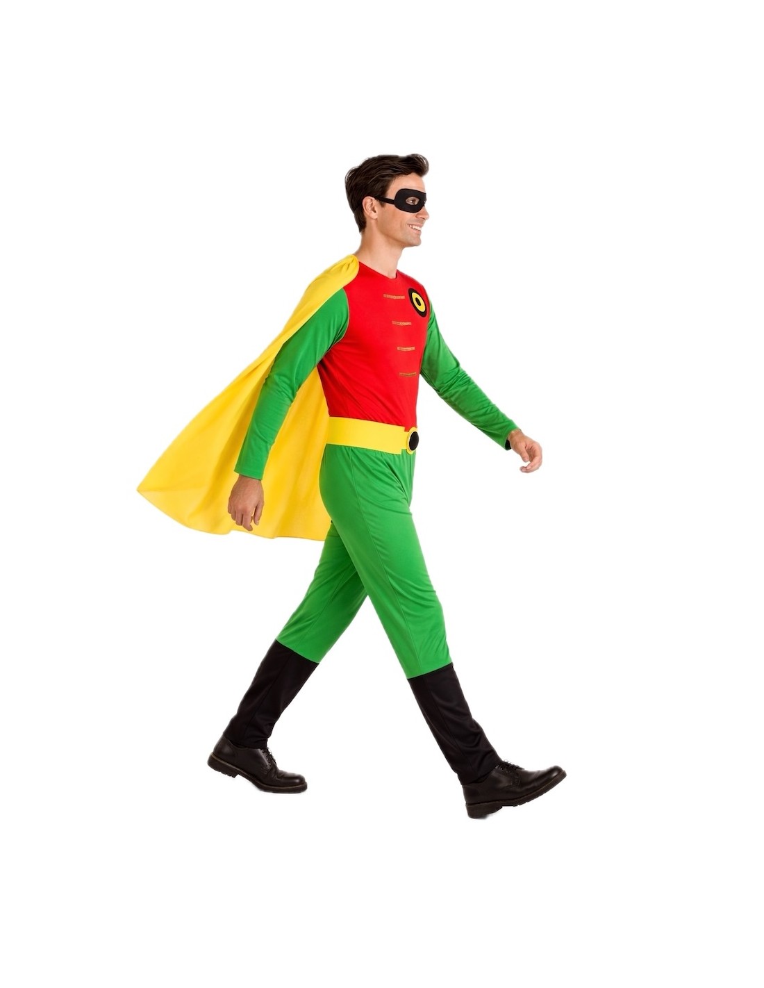 Fantasia heroica! Inclui um macacão confortável de malha macia decorado com uma peça de feltro no peito e detalhes dourados, com fecho de correr invisível nas costas e outro na braguilha para maior conforto. A capa, no mesmo tecido, fixa-se facilmente nos ombros com velcro. Completa o conjunto um cinto estruturado com espuma e fecho de velcro. Uma fantasia confortável, prática e cheia de detalhes para te sentires como um verdadeiro herói!