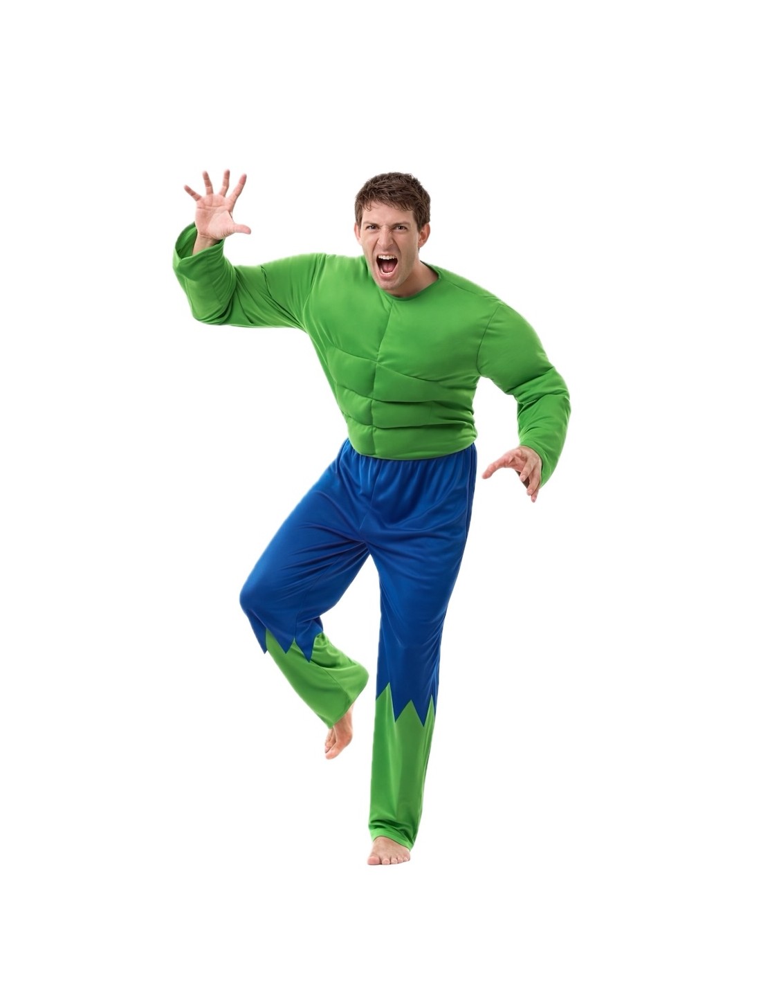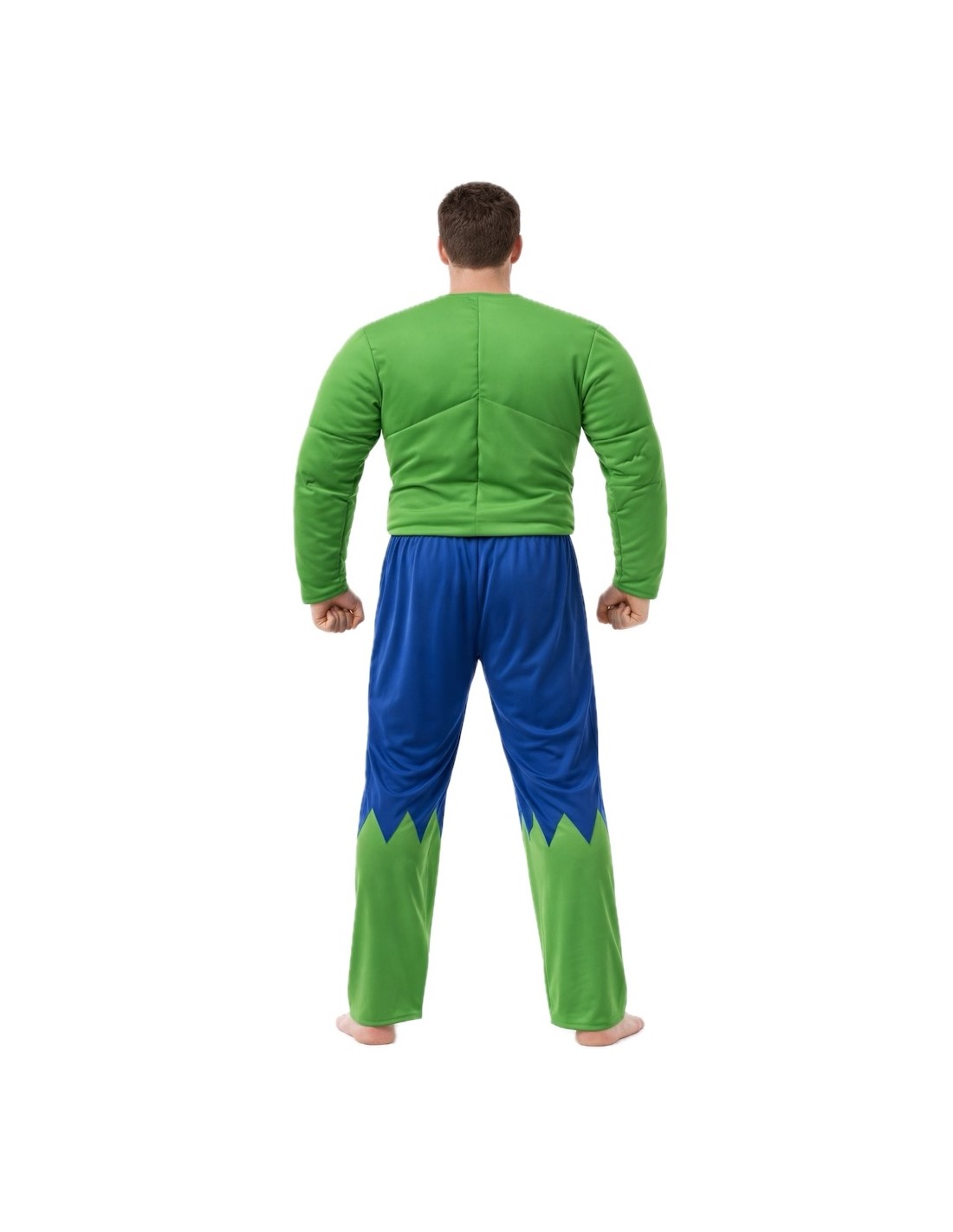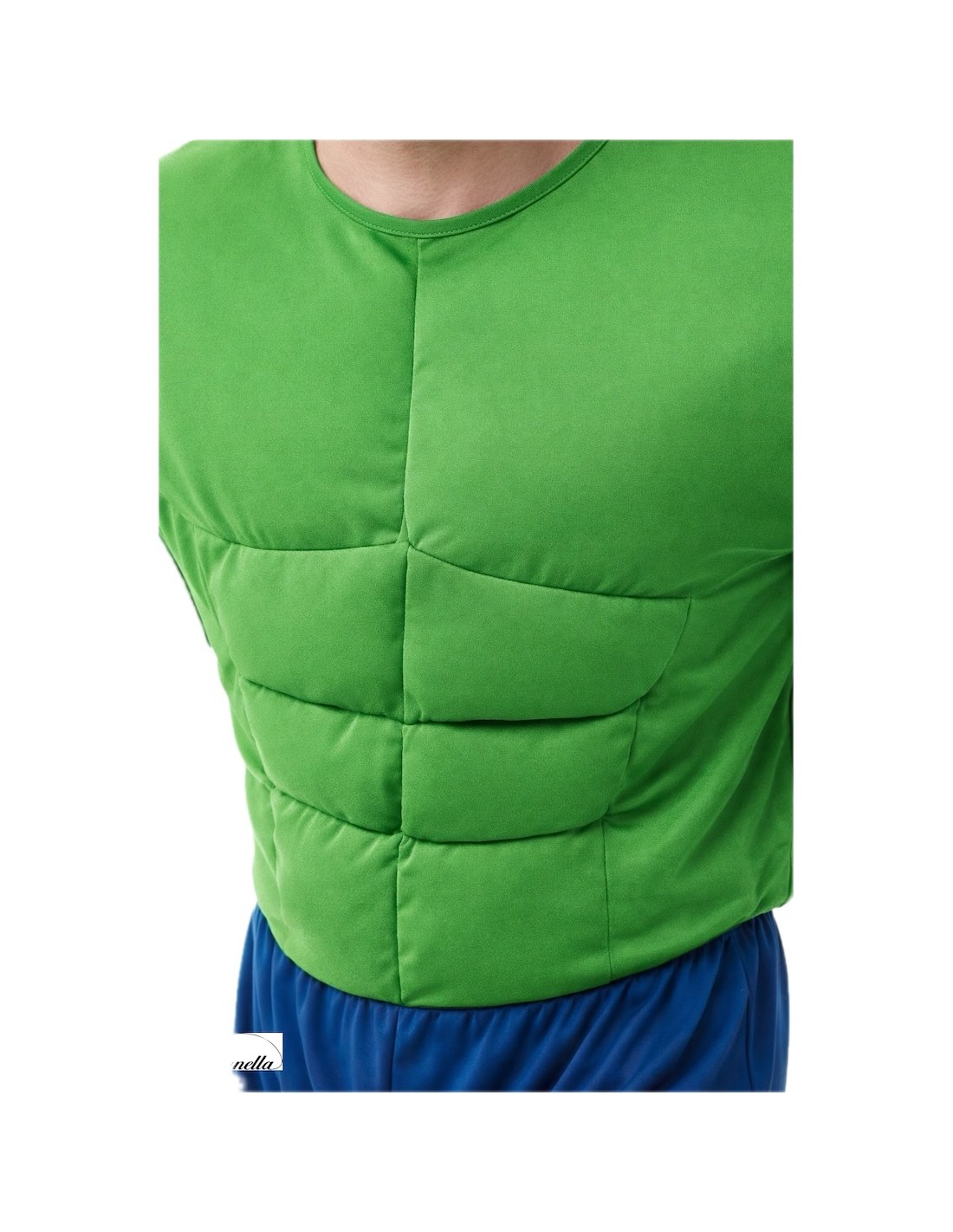 Este fato, de excelente qualidade, consiste em duas peças: a camiseta, feita em malha semielástica macia, apresenta um leve, porém denso, enchimento na parte frontal e nos braços para simular a musculatura do personagem. Os músculos internos são revestidos com um filtro suave para maior conforto. A camiseta fecha na parte de trás do pescoço com velcro. A calça, feita do mesmo tecido confortável da camiseta, tem elástico na cintura e um pequeno bolso interno. A barra da calça é da mesma cor verde fluorescente da camiseta para harmonizar o conjunto.